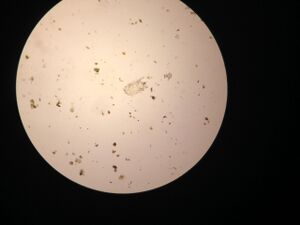 3. Mite: 1 in sample at length 100 micrometers. Clear body with legs and small hairs on back.