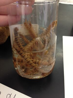 2. Diploda (round millipede): 4 in sample at length 1200 micrometers. Long body with many legs and a head.