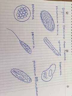 The hay infusion culture from the American University Community Garden had mold and algae growing over the top layer of the ecosystem, and had a strong smell reminiscent of dirty lake water. There were small white dots spotting the surface of the culture as well. The rest of the culture was a mixture of different dark green colors, depending on what niche of the ecosystem was being examined. When taking samples from different niches, it was seen that some samples were taken from close proximity of plant matter, and some were not. Because protists are nutrient-consuming organisms instead of making their own food, it is reasonable to believe that many of the samples near plant matter will contain protists, and that algae will be found further away from other plants, as they are photosynthesizing organisms. There were five samples pulled from the hay infusion culture: three from the bottom area of the culture, and two from the top area of the culture. There was plant matter in the vicinity of the samples pulled from the top. When using the dichotomous key to identify present algae and protists, it was found that paramecium bursaria, spirostomum, blepharisma, pandorina, paranema, and paramecium multimicronucleatum. The paramecium bursaria measured approximately 80 micrometers, is motile, and is classified as a protozoan. The spirostomum measured approximately 2 micrometers, is motile, and belongs to the protist category. The blepharisma measured approximately 100 micrometers, and is a motile protist. The pandorina measured approximately 140 micrometers, and is a motile organism belonging to the algae category. The paranema measured approximately ten micrometers, and is a motile protist. Lastly, the paramecium multimicronucleatum measured approximately 160 micrometers, and is a motile protist. The only photosynthesizing organism identified was the pandorina, the only algae found in the culture. If the hay culture was left to grow for another two months, the algae population would probably remain relatively the same, because the protists use their nutrients for food, but the competition for protist would grow, especially since the plant matter originally present in the soil samples will die out because of a lack of reproduction. The pandorina satisfies the five conditions for life because it is composed of cells, participates in an energy exchange when it uses photosynthesis, utilizes information exchange with its surroundings in order to be able to undergo photosynthesis, is able to reproduce by asexual and sexual reproduction, and it can be assumed that the pandorina is continually evolving.