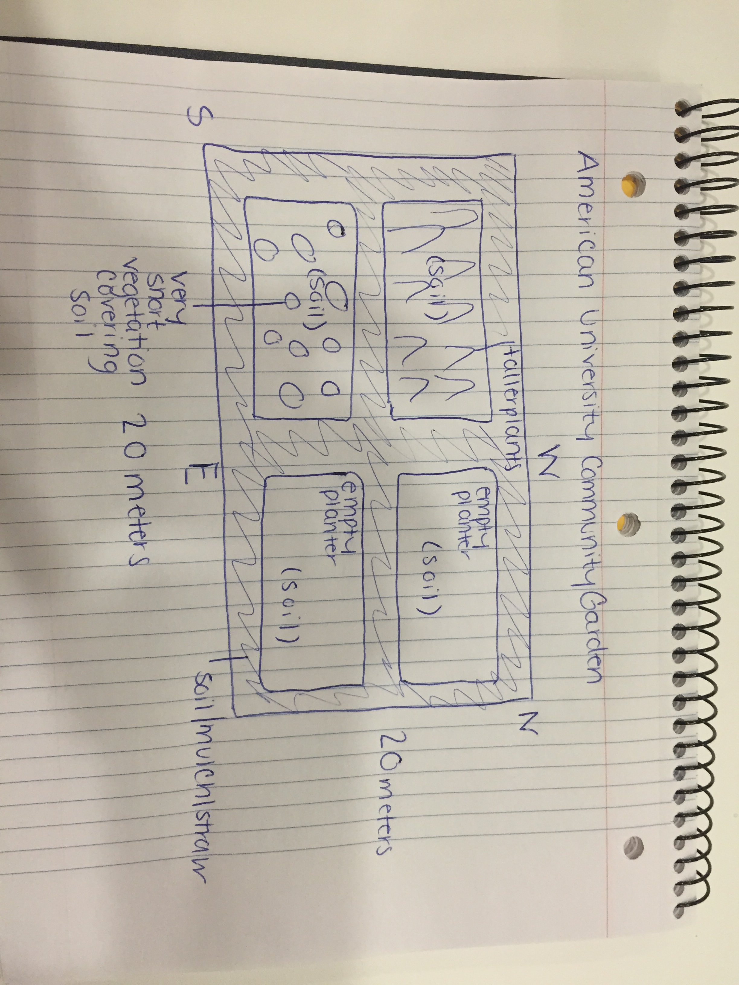 Transect 4 was located in the American University Community Garden, a square of land that features four planting areas. The majority of the topography consisted of soil which was partially frozen from the cold temperatures, and the area of land surrounding the planters was a mixture of mulch/straw and soil. Two of the four planters had vegetation growing inside them, one with smaller plants and the other with tall plants, and the other two planters were simply filled with soil. A drawing of the transect is attached. The abiotic components of the transect included the soil and straw/mulch mixture and the planters. The biotic organisms included the two kinds of plants in the planters, and the bugs in the soil and on the plants. It can be assumed that there were also protists too small for the human eye to see living among the plants and soil.