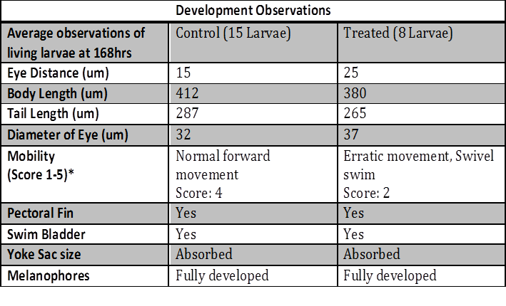 The objectives of this lab were to learn and compare embryonic development in an array of organisms and set up an experiment to study how environmental conditions affect embryonic development. Also, zebrafish can be used as a model for comparison to larger vertebrae development. For this specific experiment, zebra fish were used to observe the stages of embryonic development because they are clear and easy to see and because they share similar embryonic development to humans. In the experiment, one group of zebrafish was the control group in normal deerpark water and one group of zebrafish were treated with 25 mg of caffeine. The hypothesis was that zebrafish treated with caffeine will display defects in their development, resulting in spastic motor movement and mutations in the eyes and body length.
