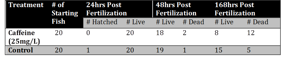 1. Twenty zebrafish embryos were placed in 20 mLs deerpark water and twenty zebrafish embryos were placed in 20 mLs of 25 mg of caffeine per liter of water solution.