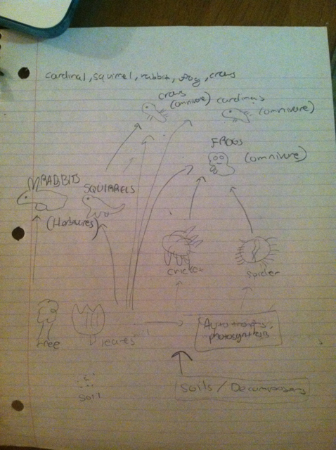 5. Verterbrates who could inhabit or pass through the transect were considered. Characteristics of the five vertebrates (two being bird species) were identified such as the classification and the abiotic/biotic elements. A food web was created based upon the observed organisms.