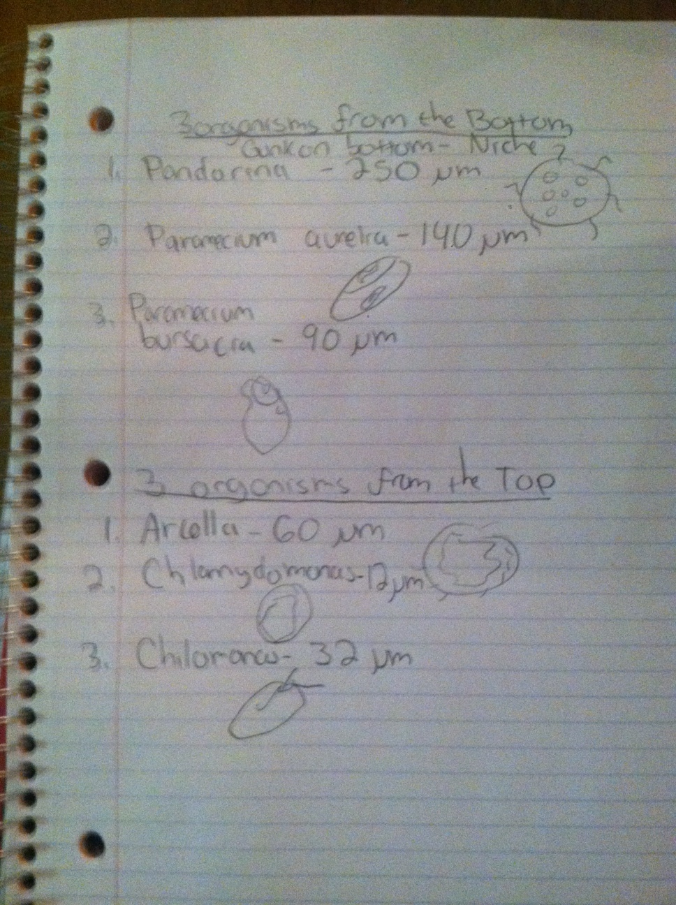 3 Organisms from Bottom Niche- Gunk on Bottom 1. Pandorina- 250 micrometers, green algae, pandorina genus, mobile using flagella. 2. Paramecium Aurelia-140 micrometers, paramecium genus, mobile using cilia. 3. Paramecium Busaria- 90 micrometers, protozoan, paramecium genus, mobile-mobile.