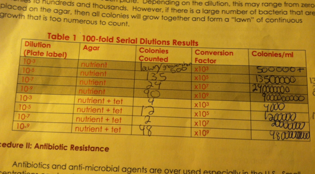 10.100 microliters was taken from the 10^-2 tube and placed on the nutrient agar plate marked 10^-3 and spread. This process was repeated on the tet plate 10^-3, creating another 10-fold dilution. This procedure repeated with the number 4 tube on the 10^-5 plate, number 6 tube on the 10^-7 plate, and number 8 tube with the 10^-9 plate.