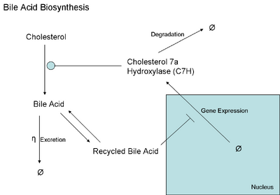 In hepatocytes, cholesterol is converted to bile acids to be excreted into the intestine via the action of the enzyme cholesterol 7α hydroxylase (CYP7A1, C7H for short). The bile acid is excreted and stored in the gall bladder and is pooled until hormonal changes within the body signal to contract and excrete the bile acid into the gut during feeding. Bile acids are key to increasing the solubility of ingested lipids. Approximately 95% of the bile acids are returned to the circulation through the ileum (termed enterohepatic circulation). The returned bile acids then inhibit the gene expression of C7H through a complex unknown pathway, but modeled simply as a direct inhibitor as seen below. The returned bile acids are returned to the bile acid pool in the hepatocytes with a certain rate constant.
