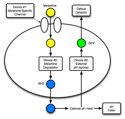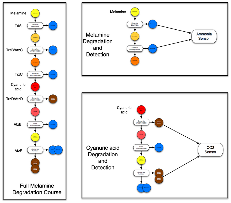 - Two strains of bacteria = more complicated process (blent says: we can have one plasmid with both melamine and cyanuric acid detection and put it in one single host/chassis)