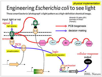 | Re-engineer E.coli to sense light | Re-engineer E.coli to sense another bacteria |