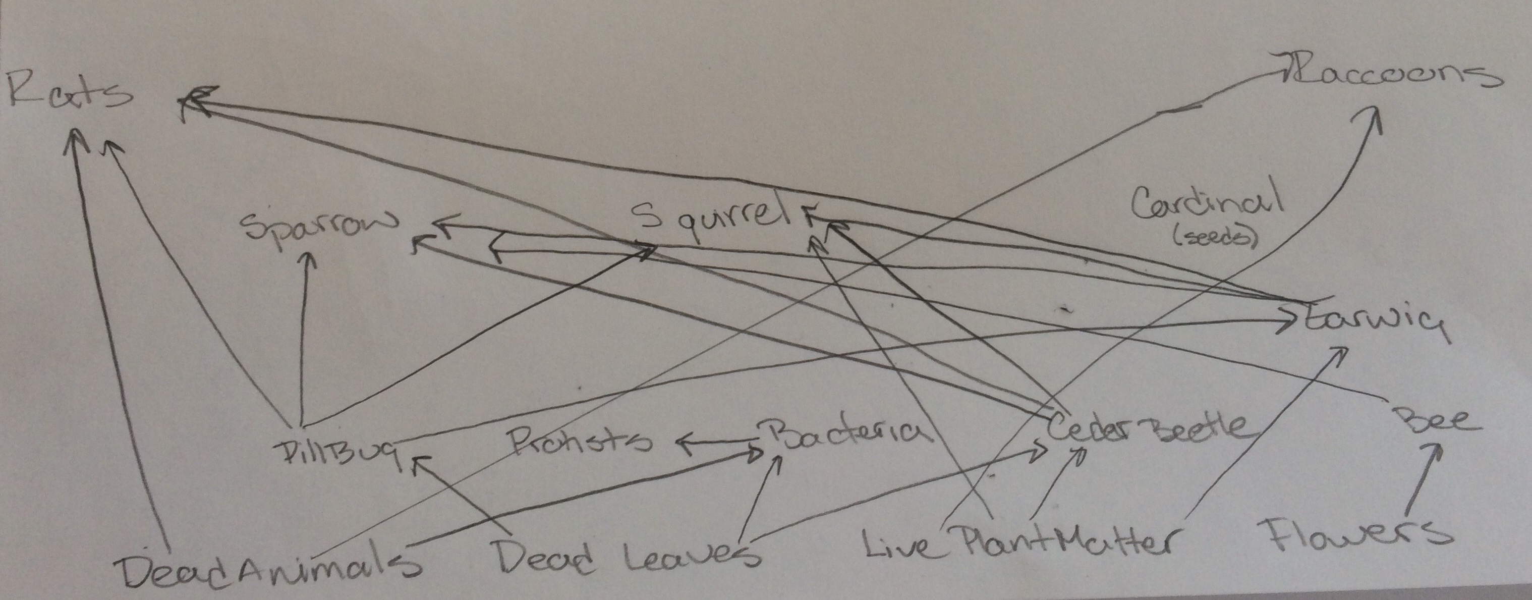 As the diagram demonstrates, although not especially diverse, there is a functioning community of organisms present within the transect. Beginning at the microbiotic level and following through to the vertebral level, the organisms present interact with each other in this common location. For example, the sparrows feed on the pill bugs that feed on the dead plant matter. If there were no plants to produce the dead plant matter, the pill bugs would not have a food source. Although the sparrows feed on a variety of other invertebrates, pill bugs seemed to be the invertebrates with the greatest population, so the sparrows may go elsewhere to find a more abundant food source if the population of pill bugs came into rapid decline. Additionally, the sparrows represent a good example of the carrying capacity within the transect. Of all the vertebrates observed, the sparrows appeared to have the largest population. This would suggest that the transect provides a proper habitat, reliable food sources, and enough water to sustain the population. However, in order to determine if the sparrow population is actually at it’s carrying capacity or if it is simply in equilibrium, further tests and observations would have to be carried out. JL