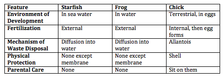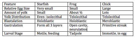 Table 1: Comparison of Embryological Features of a Developing Sea Star, Frog, and Chick