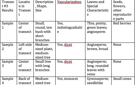 Most of the leaves found in the transect were in leaf litter because they had already died due to the winter weather. Many of the leaves were slim, green, and pointed, with red berries. Others were larger and more rounded. All of the leaves found were seed plants; some where gymnosperms, while some were angiosperms. It was difficult to determine whether the red berries were monocot or dicot because they were no longer alive.