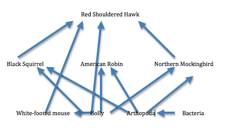 Five abiotic factors that were identified were pebbles, concrete, 2 lamp posts, cigarette butts, and mulch (note: originally listed mulch as abiotic, but now realize that it is really biotic but dead). There were many biotic factors including mid-sized trees, low bushes, ivy bushes and berries, weeds, and grass. Upon a second visit to the transect, birds were also found in the trees. Other possible animals include insects and rodents. Views of the transect:
