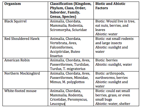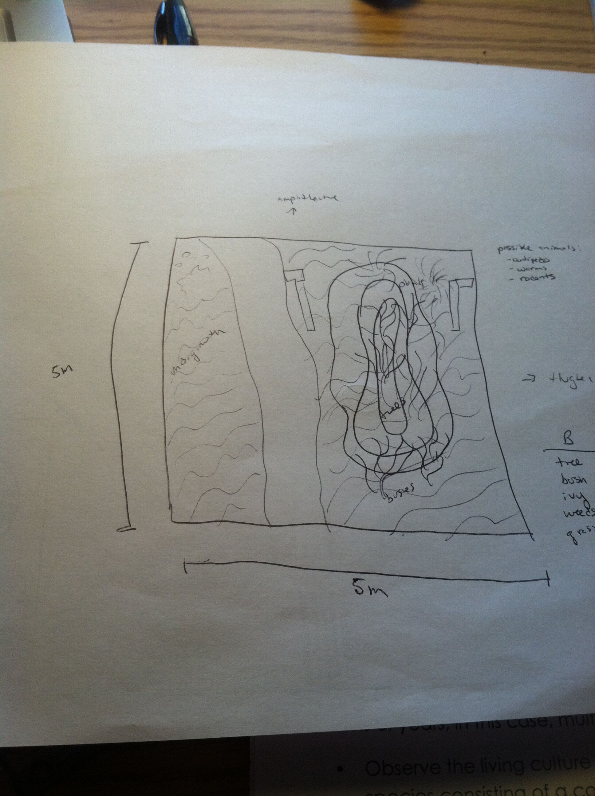 Materials and Methods: Draw a map of niche, noting topographical features as well as other defining features. Note the biotic and abiotic features (5 each). Think about what animals could possibly live there, even if they are not visible. JM