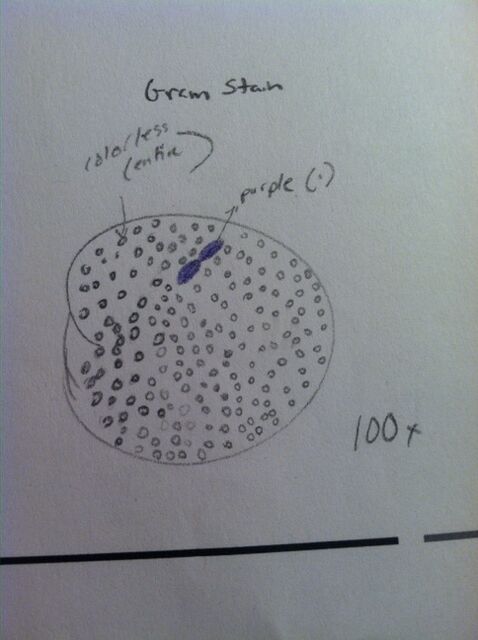 This is a depiction of our bacteria once they were Gram stained. The colorless ones were probably colorless and Gram-negative because they were decolorized for too long.