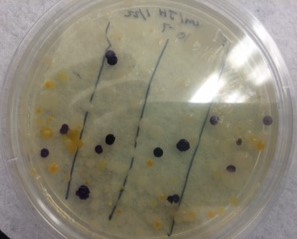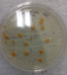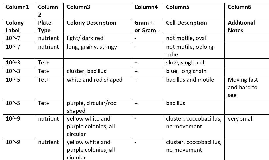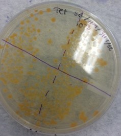 The bacteria was yellow in color and circular. All of the colonies appeared to have entire edges, appeared smooth and glistening as well as convex. This held true for both tetracycline positive plates being observed. The only difference was that the higher the dilution on the plate, the less bacteria there were.