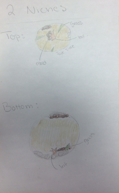 The bottom niche appeared to be very calm. There seemed to be two kinds of mold growth both around plants and not. The mold seem to grow around the leaf and the grass shoot at the bottom of the jar.