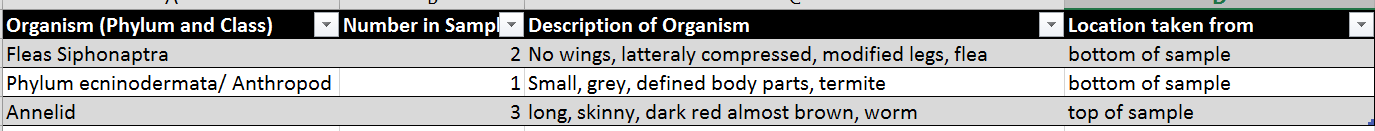 For this lab, a Berlese Funnel was set up so as to be able to observe invertebrates from the transect. To set up the funnel, 25mL of a 50:50 ethanol/ water solution was added to a 50mL conical tube. A small amount of screening material was then taped to the inside of the funnel so that large pieces of the transect that would be added later would not fall into the solution. The conical tube was then parafilmed and taped to the bottom of the funnel so that it was attached but the funnel was not in the solution. The funnel and tube were set up on a ring stand about 2 inches under a 40 watt lap before a sample of leaf litter from the transect was added to the funnel. The funnel was covered with foil and left to sit for a week before any observations were taken.