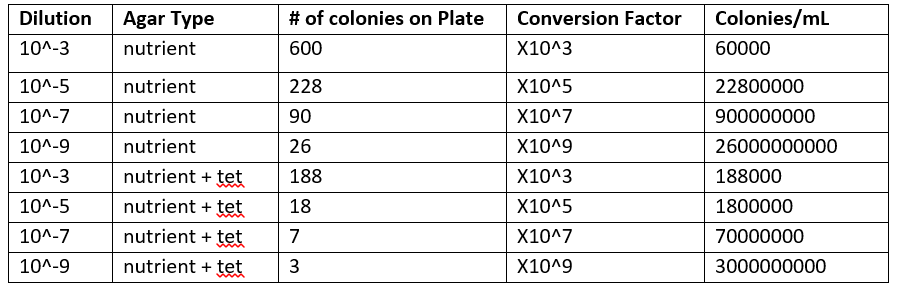 plates with a dilution of -3, -5, -7 and -9 were chosen along with tetracycline negative plates with