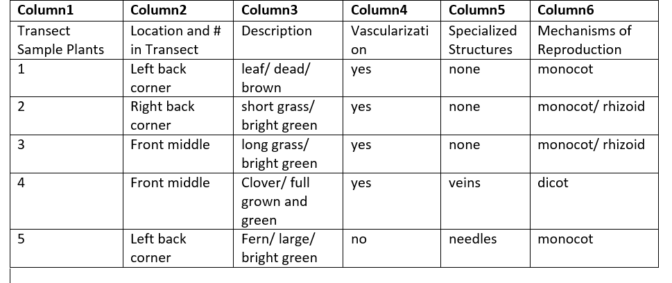 Leaves from the transect varied in size shape and color. While the grasses were found clustered with others