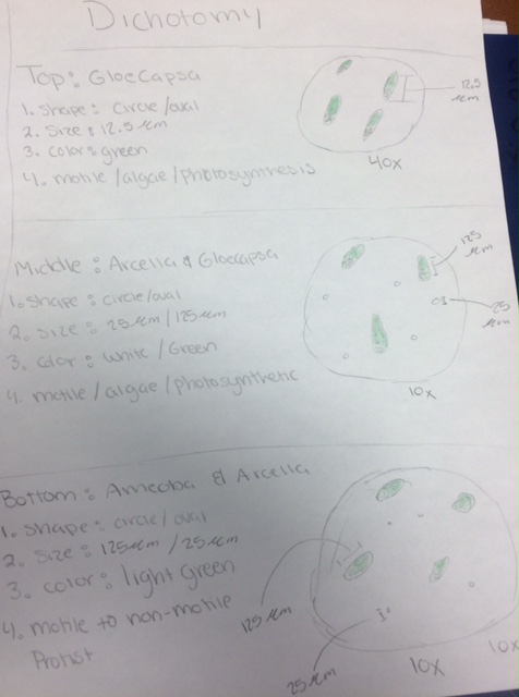 Middle: 10X, Arcella and Gloecapsa, circle/ oval, the Arcella was 25 micrometers and the Gloecapsa was 125 micrometers, white and green, motile, algae and photosynthesizing