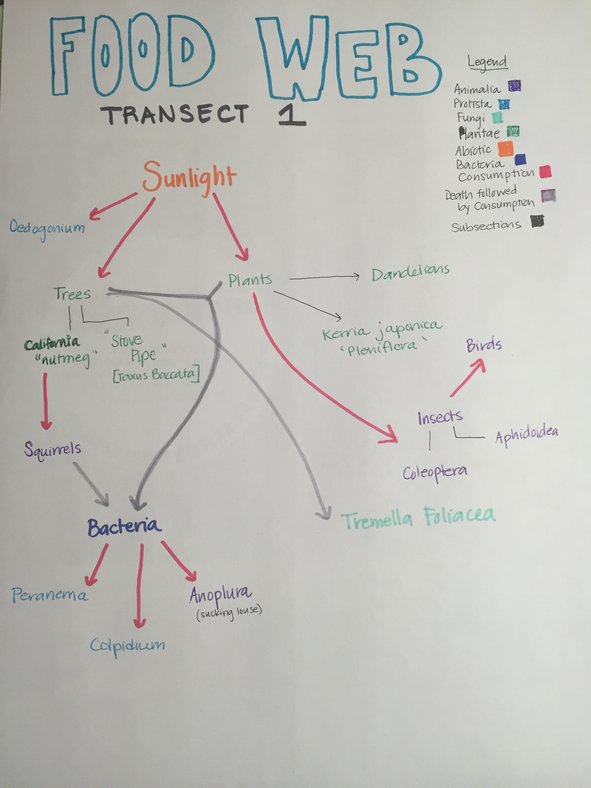 Conclusions and Future Directions: The Foodweb (Figure 7) shows the huge amount of interrelations among the micro ecosystem of Transect 1. The way the bacteria eats the things that die like foliage and animals and the bugs protozoa eat bacteria and insects eat protozoa. The projected vertebrates in the transect would also play into this, as the squirrels would eat nuts coming off of trees and the birds will eat insects. It becomes a type of cycle. I think the search for the invertebrates would have been better in a different season. The temperature and conditions not only changes the homeostasis of the ecosystem, but also greatly affects eating habits and the types of organisms we see because not all of the weeds and angiosperms are in full bloom.