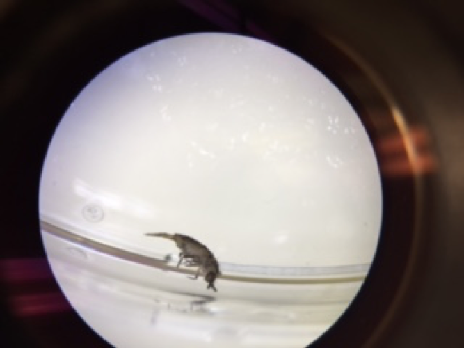 We visited the transect and collected leaf litter and samples from five different plants followed by setting up the Berlese funnel in which 25 mL of the 50:50 ethanol/water solution was placed into a conical tube. A piece of screening material was placed into the bottom of the funnel and it was placed on a ring stand and the base was covered with parafilm. A lamp was placed above the funnel and the entire structure was covered with foil. After a week it was taken apart and the liquid was decanted into a petri dish. The remaining liquid was then poured into a different petri dish. The petri dishes were placed under dissecting microscopes and observed for the presence of invertebrates. Any organisms seen were identified and characterized using a dichotomous key and differences due to their location in the funnel were noted (Bentley, 2016).