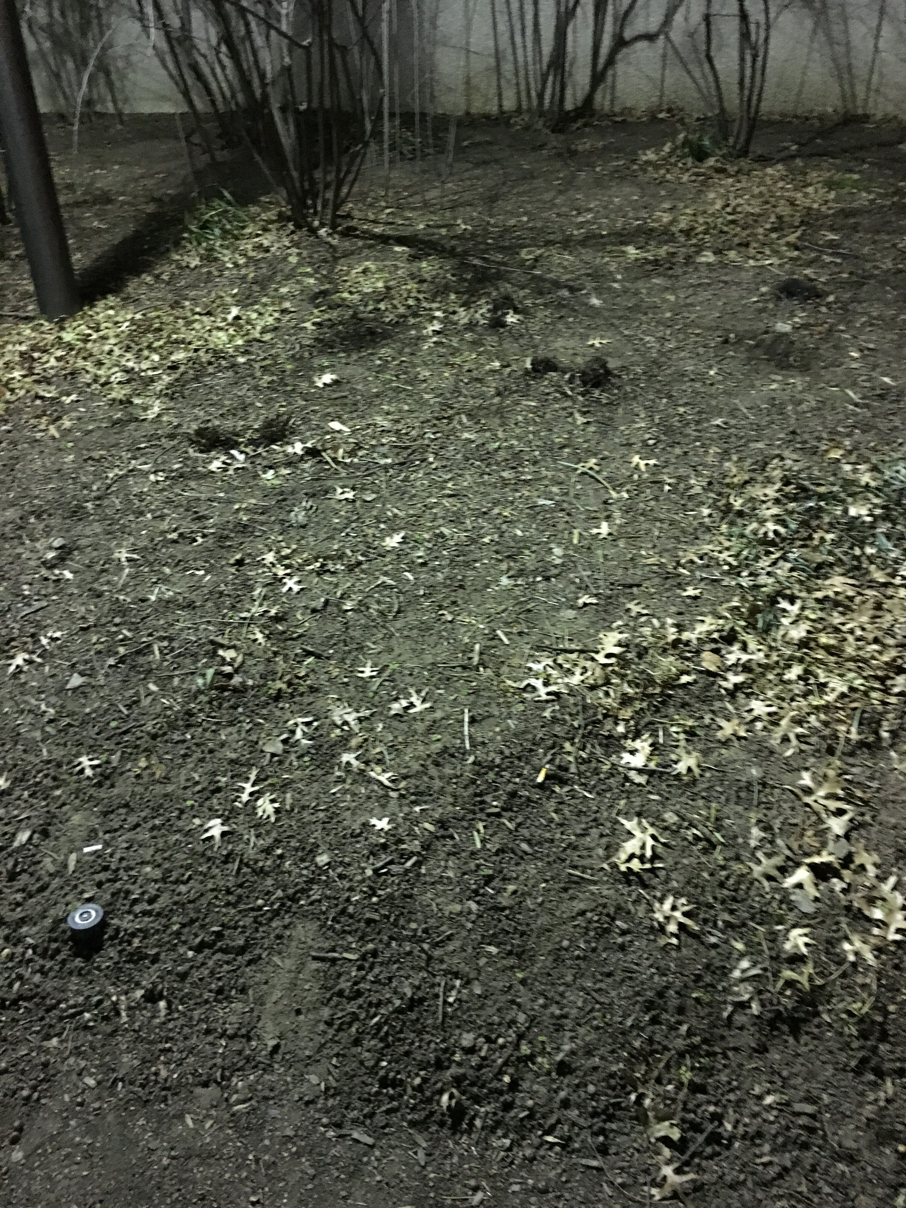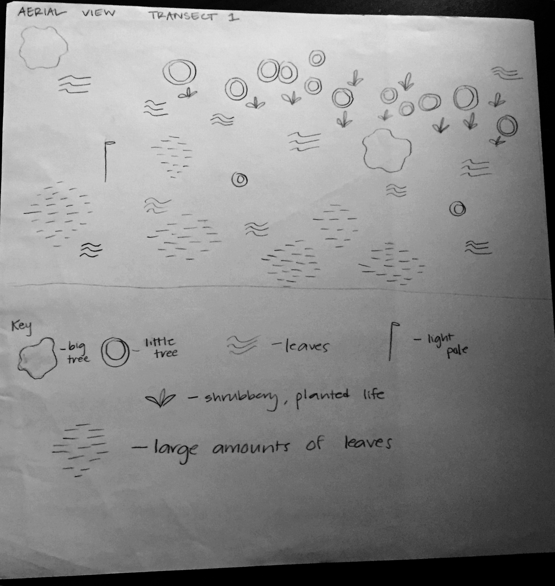 Transect Description The ground is packed hard with moist soil. There is s light splattering of leaves everywhere. There are trees of varying size, the large ones are oak. The light post is the the left of the middle and surrounded by trees, plants and leaves.