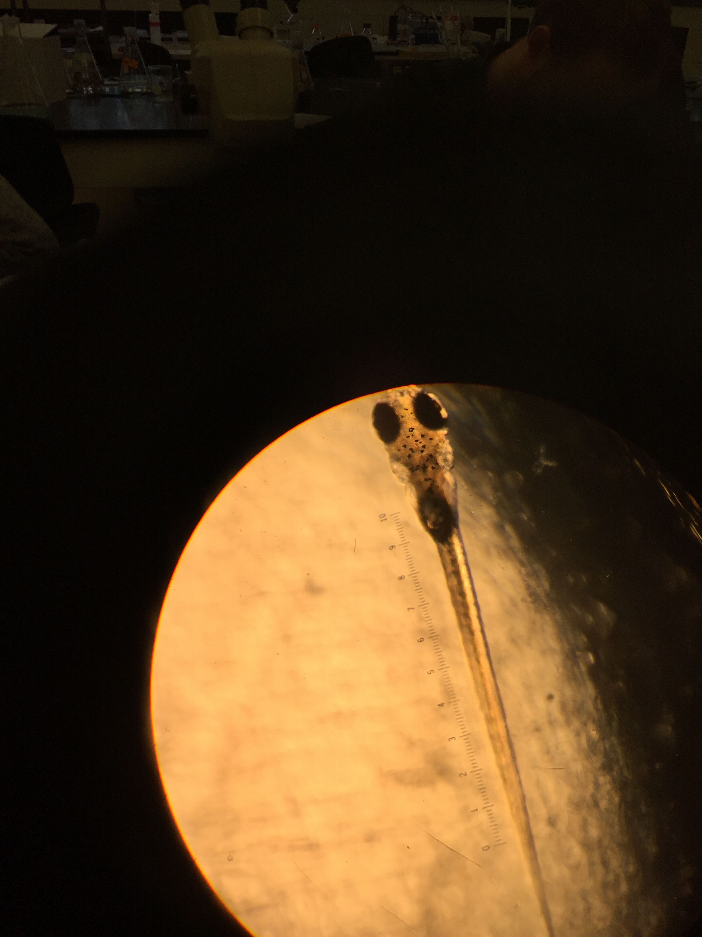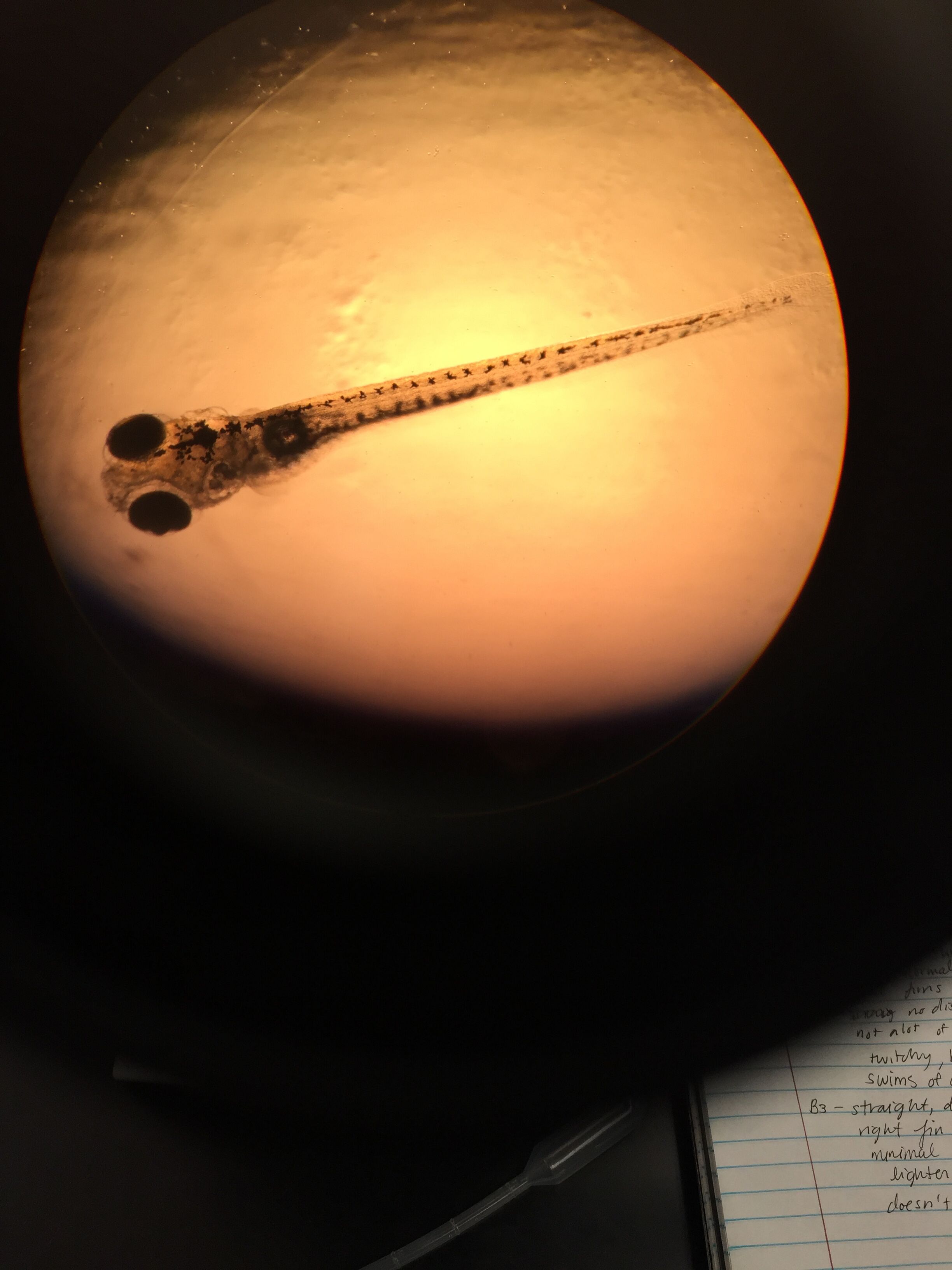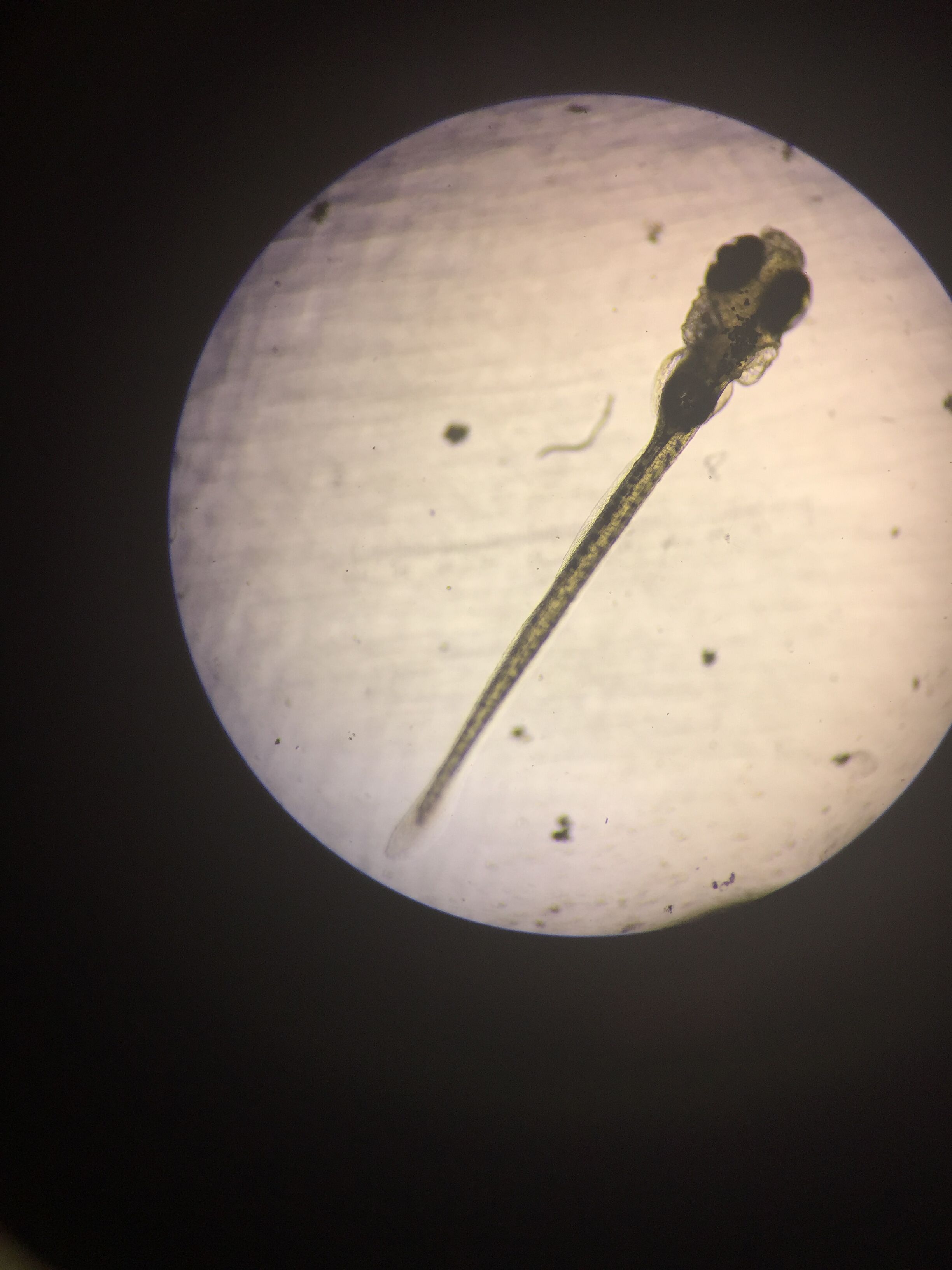 Day 7: Standard check up on fish was taken. Care was taken to replace any low water wells. Each fish was observed under a dissection microscope to ensure it was living. 5mLs of solution was removed from each well and dependent upon the condition, 5 mLs of fresh water was added corresponding to the letter on the well. 3 embryos were selected to fix and put in 2% tricaine. After they were put in formaldehyde to preserve their bodies for measurement and observations later. Two fish from each group, A, B and C, were taken and put into a slide with water from their well and observed under a compound microscope. These fish were assessed on different levels: movement, speed, movement after being jostled or prodded, eye movement, heart beat, stage of development, curve of tail, swim bladder, fin size and pigmentation. They were then placed back into their wells using disposable pipettes. The remaining fish were again fed 15 microliters of brine shrimp with a P1000 pipette.