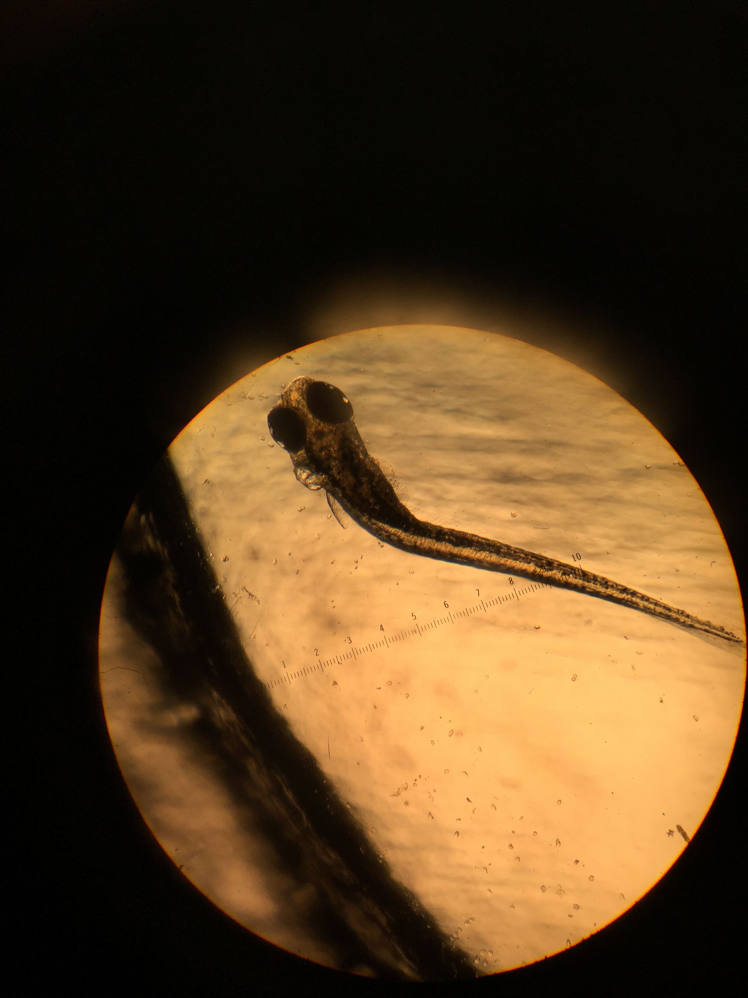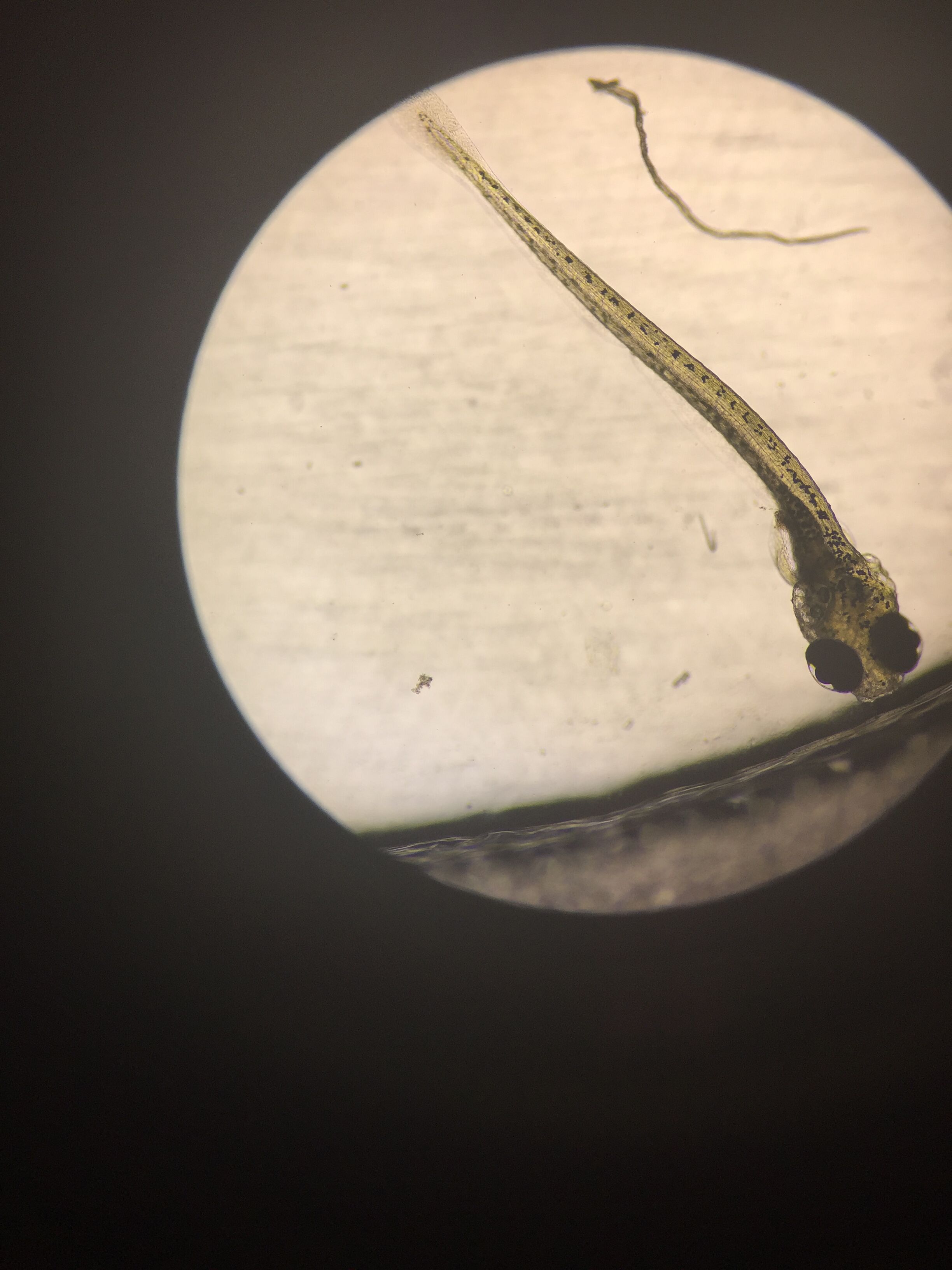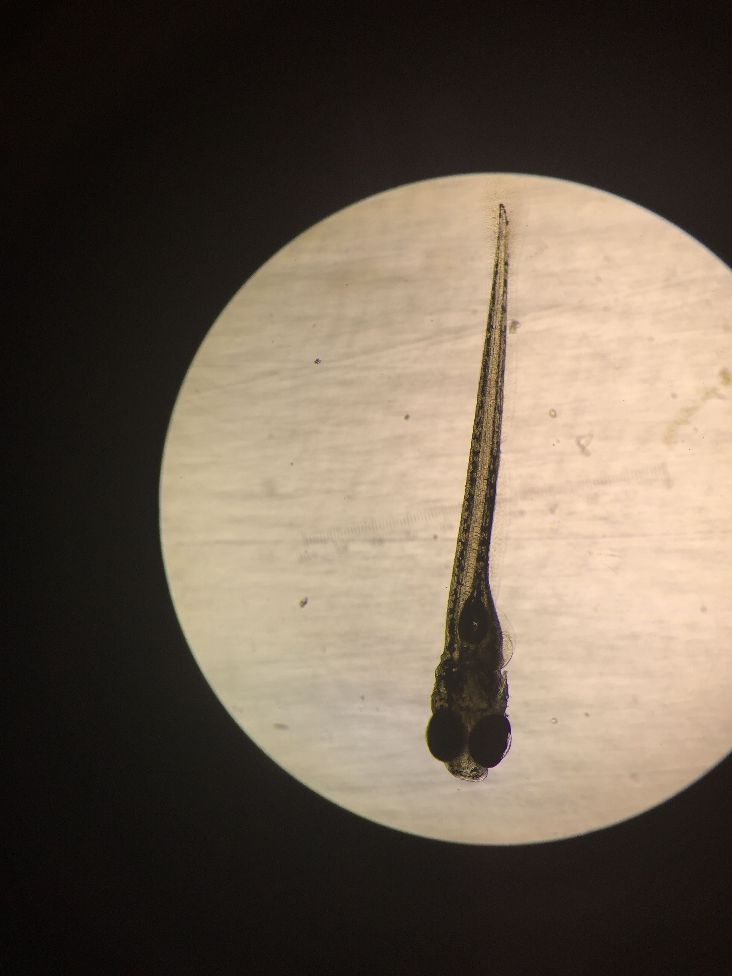 Day 7: Standard check up on fish was taken. Care was taken to replace any low water wells. Each fish was observed under a dissection microscope to ensure it was living. 5mLs of solution was removed from each well and dependent upon the condition, 5 mLs of fresh water was added corresponding to the letter on the well. 3 embryos were selected to fix and put in 2% tricaine. After they were put in formaldehyde to preserve their bodies for measurement and observations later. Two fish from each group, A, B and C, were taken and put into a slide with water from their well and observed under a compound microscope. These fish were assessed on different levels: movement, speed, movement after being jostled or prodded, eye movement, heart beat, stage of development, curve of tail, swim bladder, fin size and pigmentation. They were then placed back into their wells using disposable pipettes. The remaining fish were again fed 15 microliters of brine shrimp with a P1000 pipette.