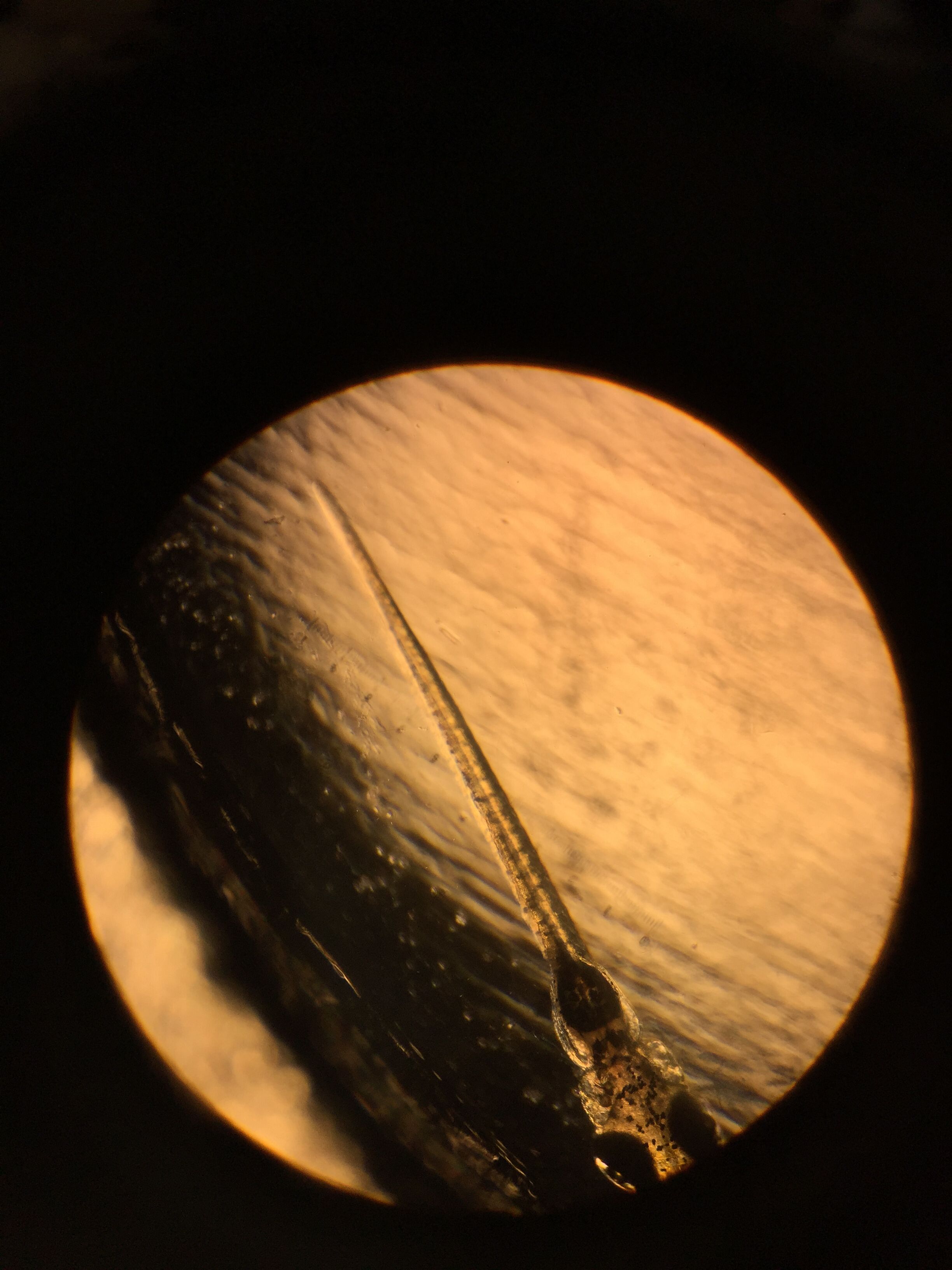 Day 11: Standard check up on fish was taken. Each fish was observed under a dissection microscope to ensure it was living. 5mLs of solution was removed from each well and dependent upon the condition, 10 mLs of fresh water was added corresponding to the letter on the well. Two fish from each group, A, B and C, were taken and put into a slide with water from their well and observed under a compound microscope. These fish were assessed on different levels: movement, speed, movement after being jostled or prodded, eye movement, heart beat, stage of development, curve of tail, swim bladder, fin size and pigmentation. They were then placed back into their wells using disposable pipettes. The remaining fish were again fed 15 microliters of brine shrimp with a P1000 pipette and two drops of paramecium.