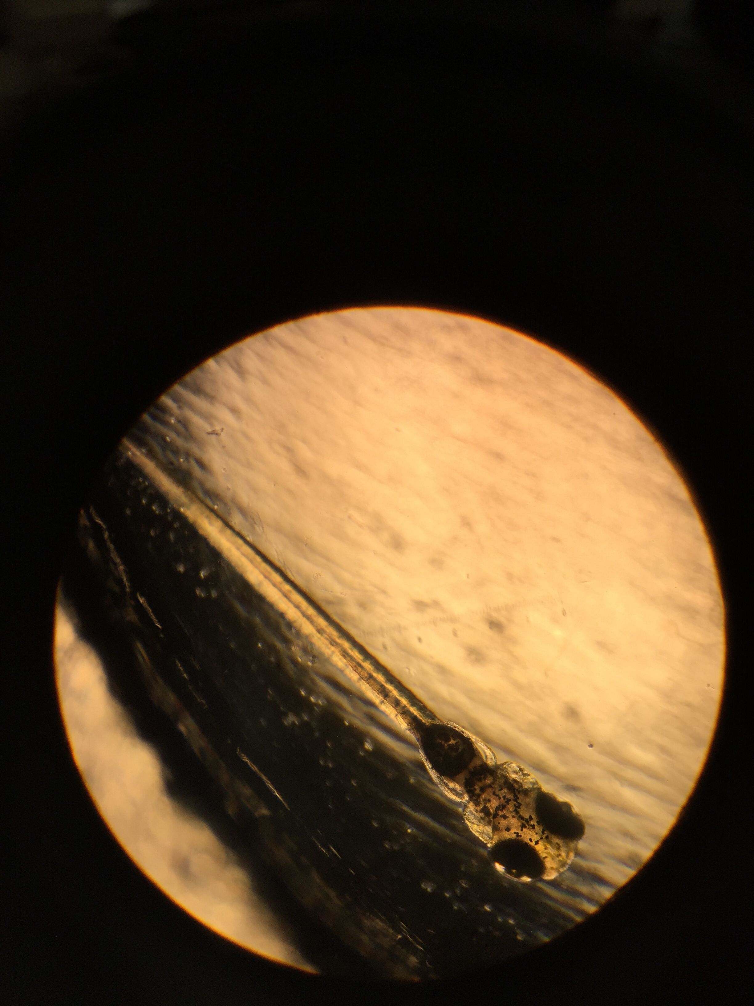 Day 6 Wednesday 2/24/26 • 5:30pm • A8 dead, shell of body still visible, no disintegration • A1-A8 normal development, ~40 units @ 1.2x on dissecting scope, very motile • A7 nonmotile, deformed • B1-B8 ~40 units @ 1.2x, motile appear normal • C1-C5, C7, C8 all ~40 unites at 1.2X slowed motility delayed response to poking with transfer pipette • C6 deformed ~31 units @ 1.2x
