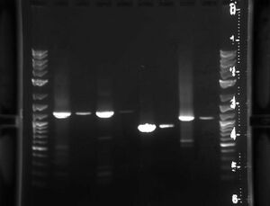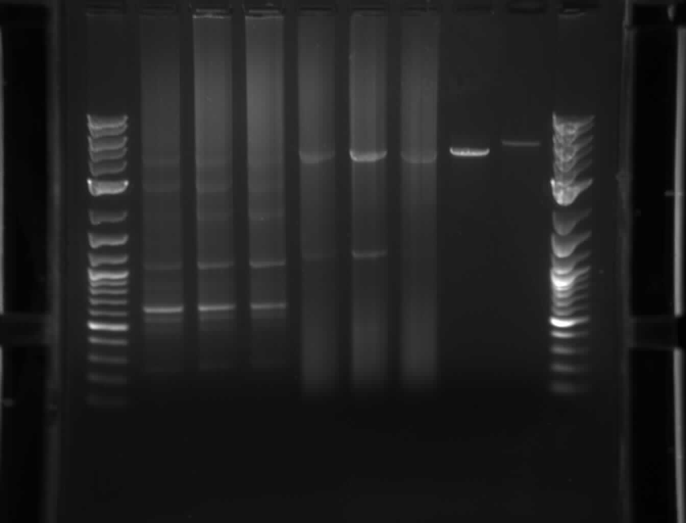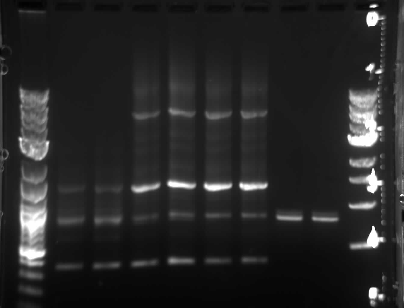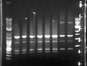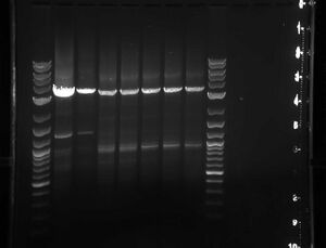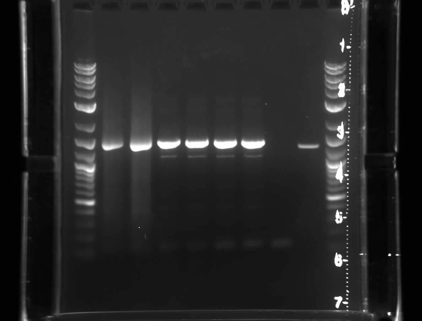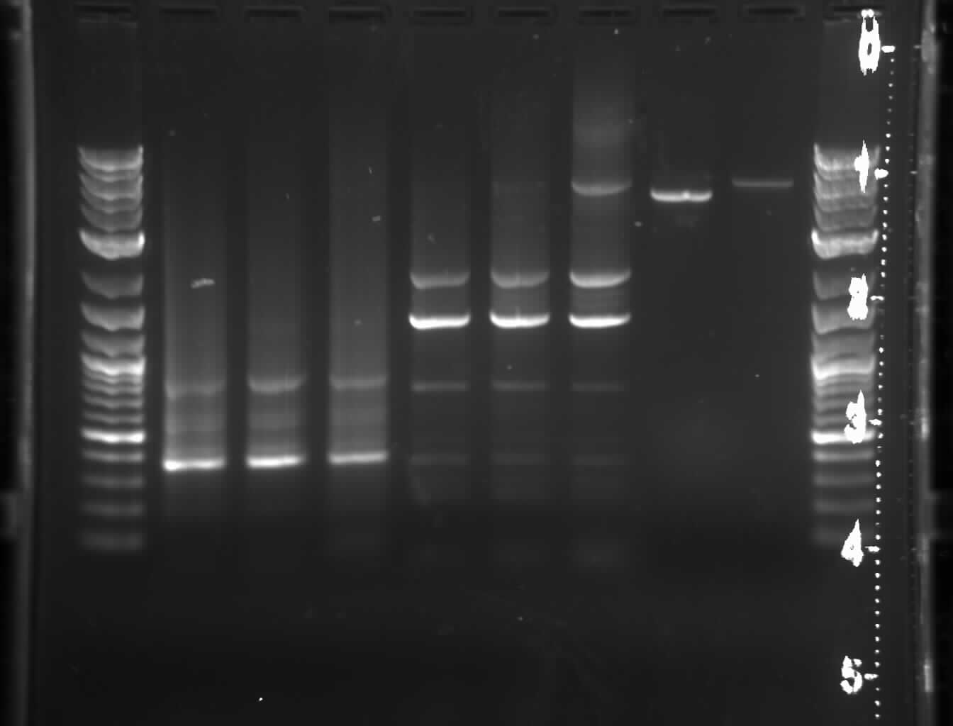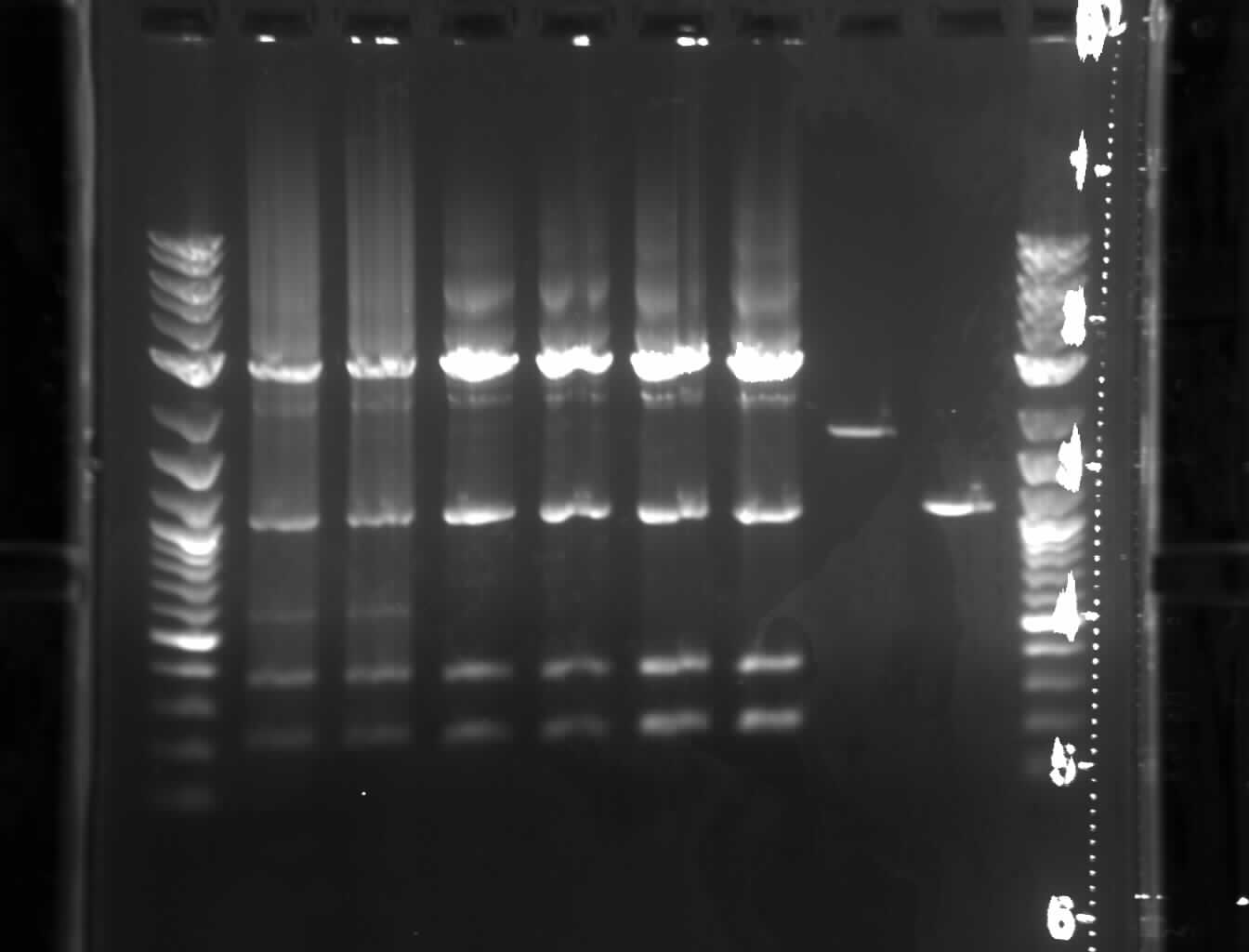 The major products in lanes 2-3 and 6-9 seem to be the right size. Lanes 4-5 have the wrong pcr product. Every lane has multiple products in the wrong positions, which suggests a lot of unspecific binding. I may need to repeat the PCR with an increased annealing temperature.I also may need to PCR amplify section 6 separately so that I can shorten the extension time specially for that section.