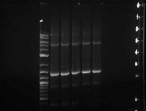 I ran a small gel on the amplification of sections 5 through 9 using accuprime pfx dna polymerasepcr amplification of sections 5 through 9 from the pcr assembled product and from T7+ DNA, using AccuPrime Pfx DNA Polymerase.
