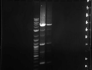 I finally have a PCR product at the correct position. This indicates that my PCR assembly has most likely been working. I will need to try the same amplification on the sections 5 through 9 purified assembly product.