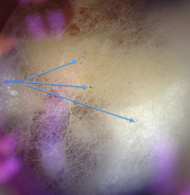 "Fungi Groups:" I did not look at the fungi from my group under the microscope, but I did look at samples that had been set up at the fungi station (See Figure 9). This sample of fungi was the Rhizopus stolonifer that the packet described, with white hyphae covering the petri dish and small black sporangia.