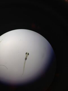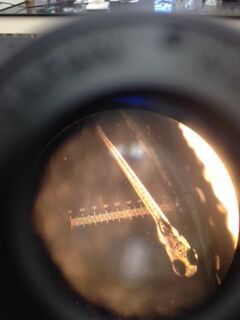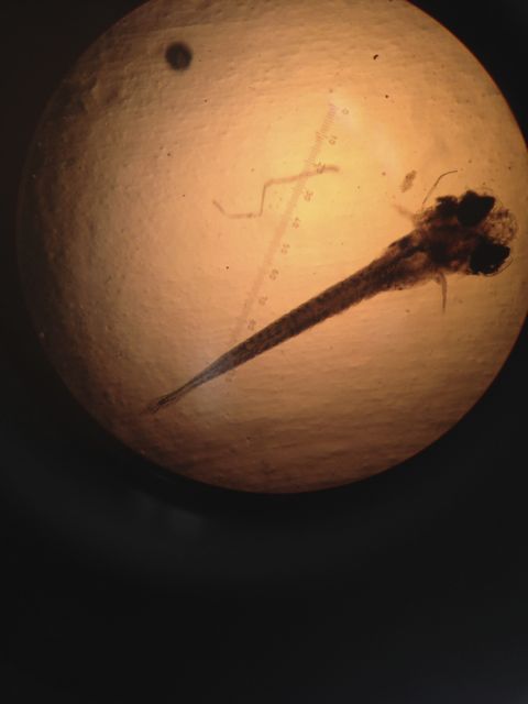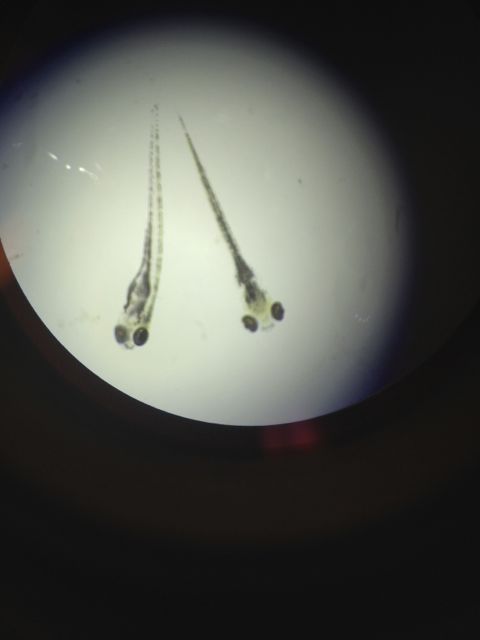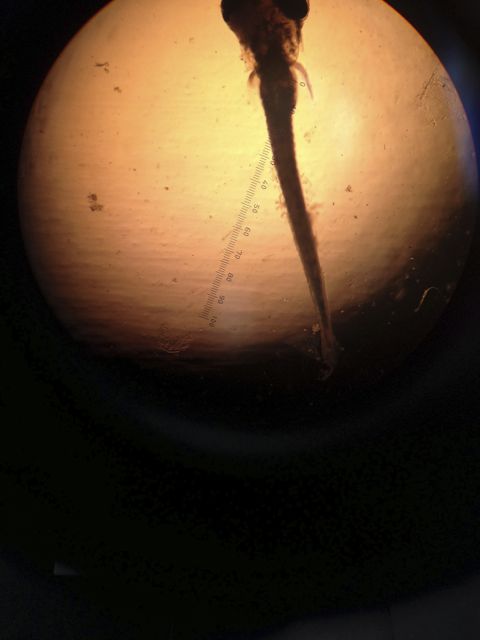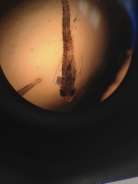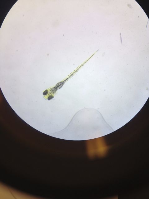 11) Examine at least one larvae from the non-caffeinated and caffeinated petri dishes. Record observations based on degree of body and tail pigmentation, eyes and eye movement, heart/heart rate, pectoral fin development, development of the swim bladder, development of the mouth, and general movement.