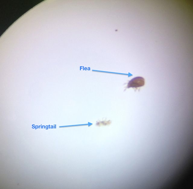 Size range: The organisms that we found were similar in size--between 1.5 and 2mm. The flea was the largest invertebrate that we found and the springtail was the smallest. There were lots of fleas present in the leaf litter--we found two right next to one another and another near the springtail.