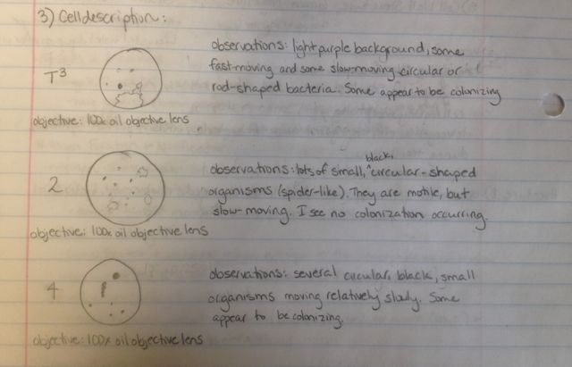 5. I recorded my observations of the three plates in Table 3, including the colony description, number of colonies per mL of culture, and cell description. I also sketched what I saw under each lens, and at what magnification I saw it (Figure 8).