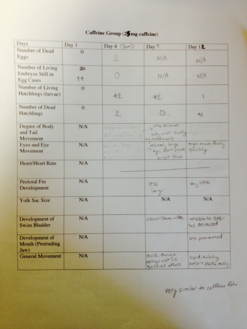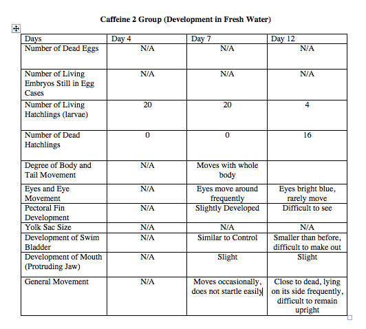 Conclusions: Unfortunately, a majority of our zebrafish (even the controls) died before they were supposed to, probably because of the warm temperatures of the water that sped up their growth--they ate through their embryo faster than they were supposed to. For that reason, we decided to base our results on what happened to the zebrafish after seven days, and while we collected data on day 12 and 14, that data does not go into our main conclusions about the effects of caffeine on the zebrafish. We established that the caffeine slightly stunted the growth of the zebrafish in comparison to the controls, and even the zebrafish that we extracted from the caffeine after they hatched and put in fresh water did not grow as much as the controlled zebrafish. Many times, it was not possible for us to get readings on the zebrafish heart rates, or even take measurements since they moved around very quickly (we obtained some measurements by observing the dead zebrafish). We also found that the caffeinated fish grew smaller swim bladders and were more reactive than the controlled fish in the first few days of observation. The caffeinated fish also died at a much faster rate than the control fish, as is evident by "Day 12 Caffeine (Dead)" versus "Day 12 No Caffeine (Dead)." While further research is desirable, and if this experiment was to be repeated we would better regulate the water temperature to make sure no zebrafish died from starvation, it is apparent that caffeine does have some effect on the development of zebrafish.