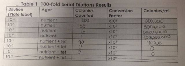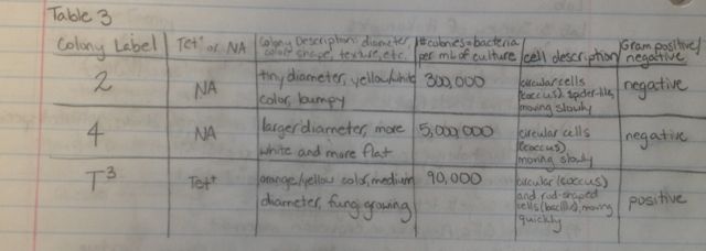 1. I answered the first bolded question in the packet (see Lab 3 Information Packet Questions above) by comparing the agar plates with the agar + tetracycline plates as well as Table 2.