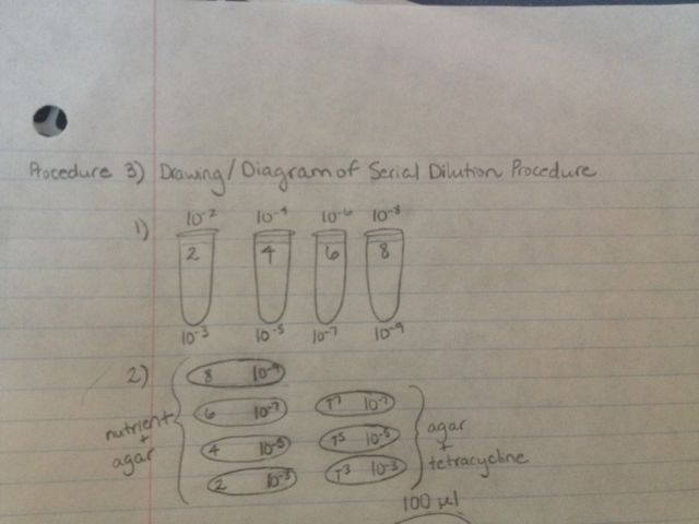 Conclusions: Since we left the agar plates to incubate for a week, we could not immediately verify whether or not our hypotheses were correct. After preparing the agar plates, we maintained our predictions that more bacteria would grow on the less diluted plates, and that no colonies would grow on the tetracycline plates. --KB