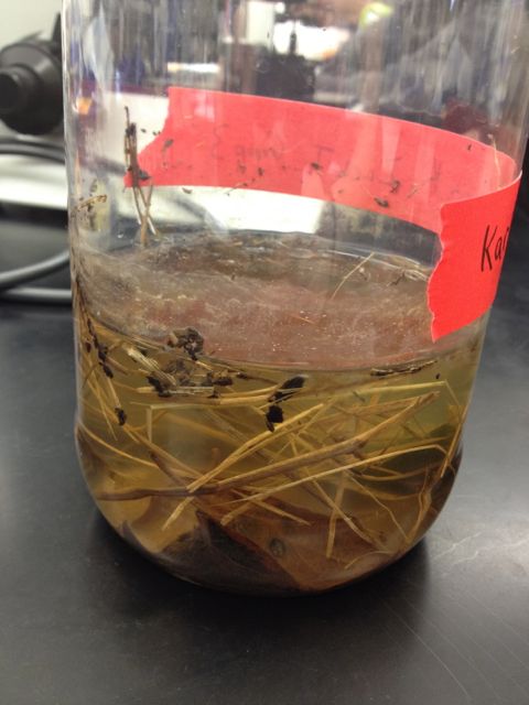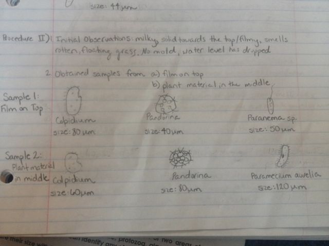 Samples: My group took one sample from the film on top and another from plant material in the middle. The majority of organisms closer to the plant matter are probably heterotrophic and the plants act as a source of food for them. The organisms in the top film of the culture are probably more autotrophic in nature and therefore do not need to be near the plants.