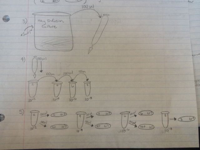 Objective: The objective of this procedure was to prepare for the next week's lab by applying the hay infusion culture to agar petri dishes. The colonies would then be able to grow and replicate faster so that we could observe them for our next lab. Applying them to both agar/nutrient petri dishes and agar + tetracycline plates would allow us to determine whether any of the bacteria was antibiotic resistant. We hypothesized that no colonies would grow on the tetracycline plates because the bacteria would not be antibiotic resistant. We also hypothesized that more bacteria would grow on the less diluted plates.