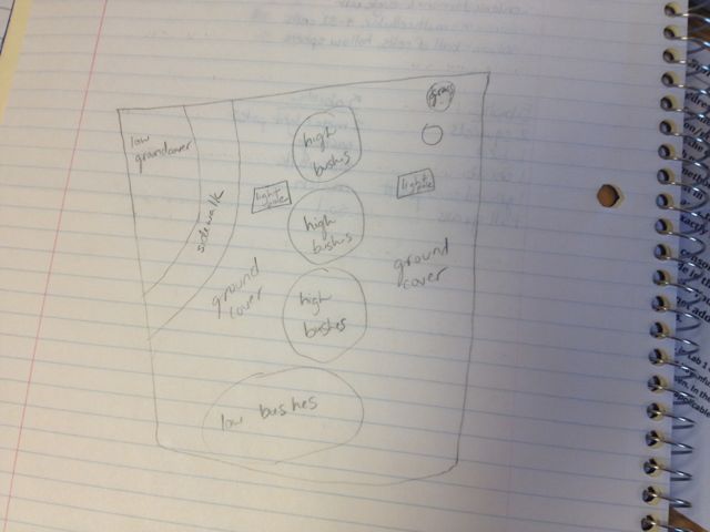 General Characteristics of Transect Three: Location: American University Campus in between Hughes Hall and Butler Pavilion Topography: low ground cover throughout most of the area with a sidewalk in the upper left side. There are three high bushes in the middle and several low bushes at the very front. There are some high grasses in the upper right hand corner, and two light poles on either side of one of the three high bushes.