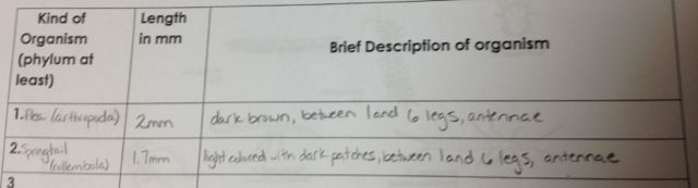 4. Once found, use the dichotomous keys and website (http://www.hope.edu/academic/biology/leaflitterarthropods/) to identify the type of organism
