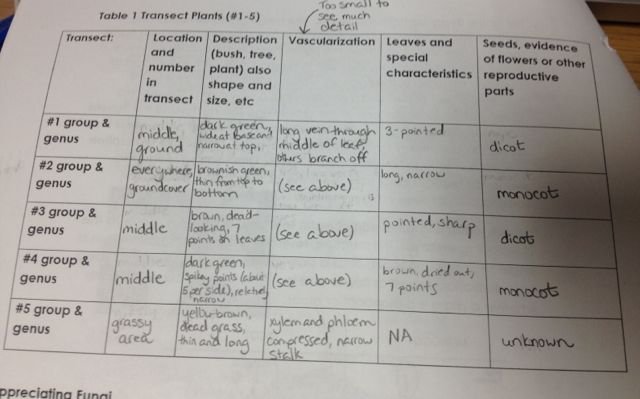 Conclusions: We successfully collected the plant samples necessary to both make a Berlese Funnel and try to identify different types of plants in our transect. We visited the different stations and learning more about plant vascularization (xylem and phloem), plant specialization (cuticle, stomata, guard cells, parenchyma cells, mesophyll, and palisade cells), plant reproduction (gametophyte and sporophyte phases, ovary, cotyledon, monocots and dicots), and appreciating fungi (hyphae, mycelium, sporangia, spores, and rhizoids). This information gives us a better ability to understand not only plants in general, but the specific plants that grow on our transects. Furthermore, it is useful for future experiments that involve studying plants, such as if we chose to examine our Berlese Funnels for more than just invertebrates in the next week's lab. --KB