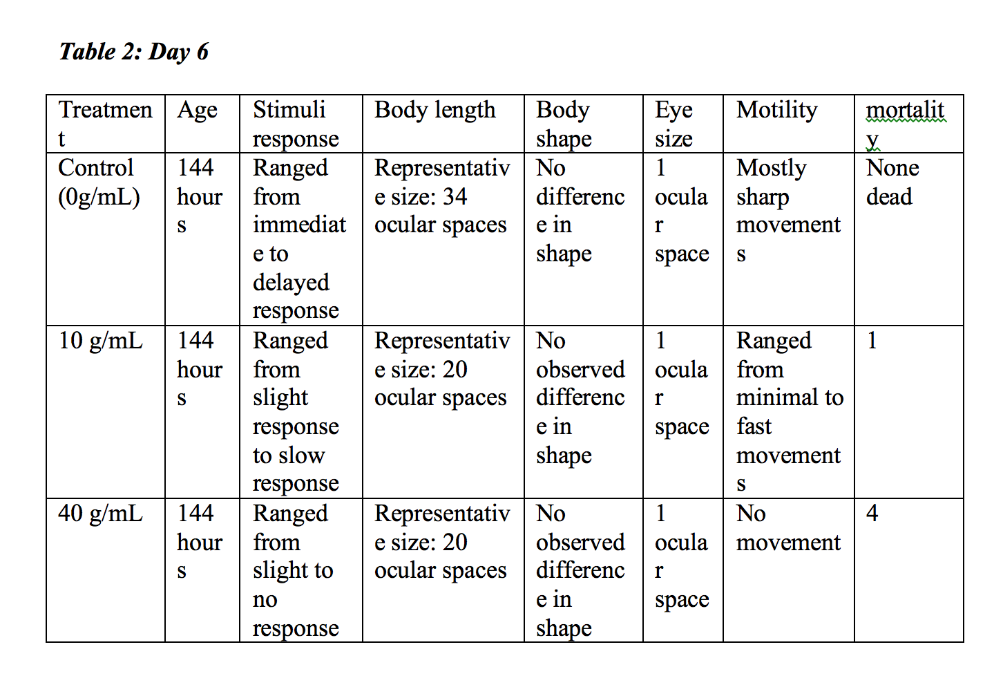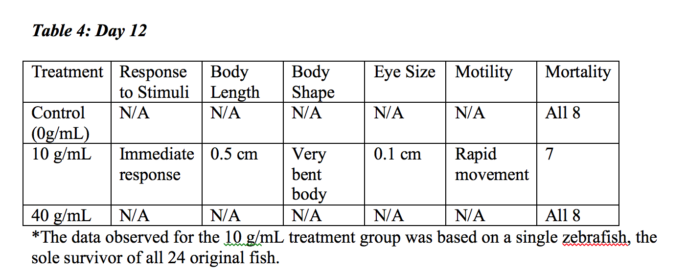 Data and Observations: This experiment was done in order to observe the effects of various nicotine concentrations, including 0 g/mL, 10 g/mL, and 40 g/mL, on zebrafish who were fertilized within the respective environment. All of the fish were observed in each concentration for changes in their size, body shape, eye size, and body length. Along with these morphological features, the initial days measured the approximate age as well. Table 1, depicting the observations of Day 3 reveals that one fish had hatched in the low nicotine concentration, and the rest of the fish were aged to be anywhere from 36 to 48 hours old, with 2 dying in just the third day. Observations taken on Day 6, which can be seen in Table 2, reveal that as the concentration of nicotine increased, the response to stimuli and overall movement of the fish decreased. It can also be inferred that the nicotine affected the treatment body shape, and therefore length, in that it was found to be 14 ocular spaces less than the control group in length. It was found that at this point, the control and treatment fish both had similar sized eyes. The mortality rate had continued to increase at this point, and it was heavily prevalent in the highest nicotine concentration. Day 7 revealed more deaths within both the highest nicotine concentration, but also the 10 g/mL concentration as well, which can be seen in Table 3. On this day, it was also, strangely, observed that the movement in all three concentrations almost none existent. Aside from a few fish in each concentration, the majority were not moving and had little response to stimuli. At this point, it was calculated that 9 fish were dead total. Finally, shown in Table 4, Day 12 produced the most drastic results in that 23 of the 24 original zebrafish had died and the only surviving fish was in a 10 g/mL nicotine concentration well. It was found to be moving very well and had a quick response to stimuli, but it had a very bent body and large eyes.