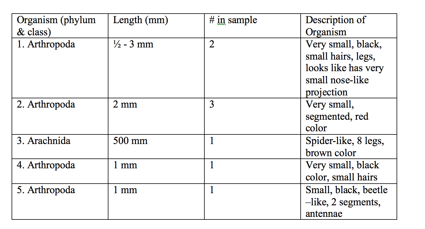 Invertebrate Characterization Organism (phylum) Length in mm Number in sample Description 1. Arthropoda ½-3 mm 2 Very small, black, small hairs, legs, nose-like projection 2. Arthropoda 2 mm 3 Very small, segmented, red color 3. Arthropoda 5 mm 1 Spider-like, 8 legs, brown in color 4. Arthropoda 1 mm 1 Small, black in color 5. Arthropoda 1 mm 1 Small, black, beetle-like, 2 segments, antennae