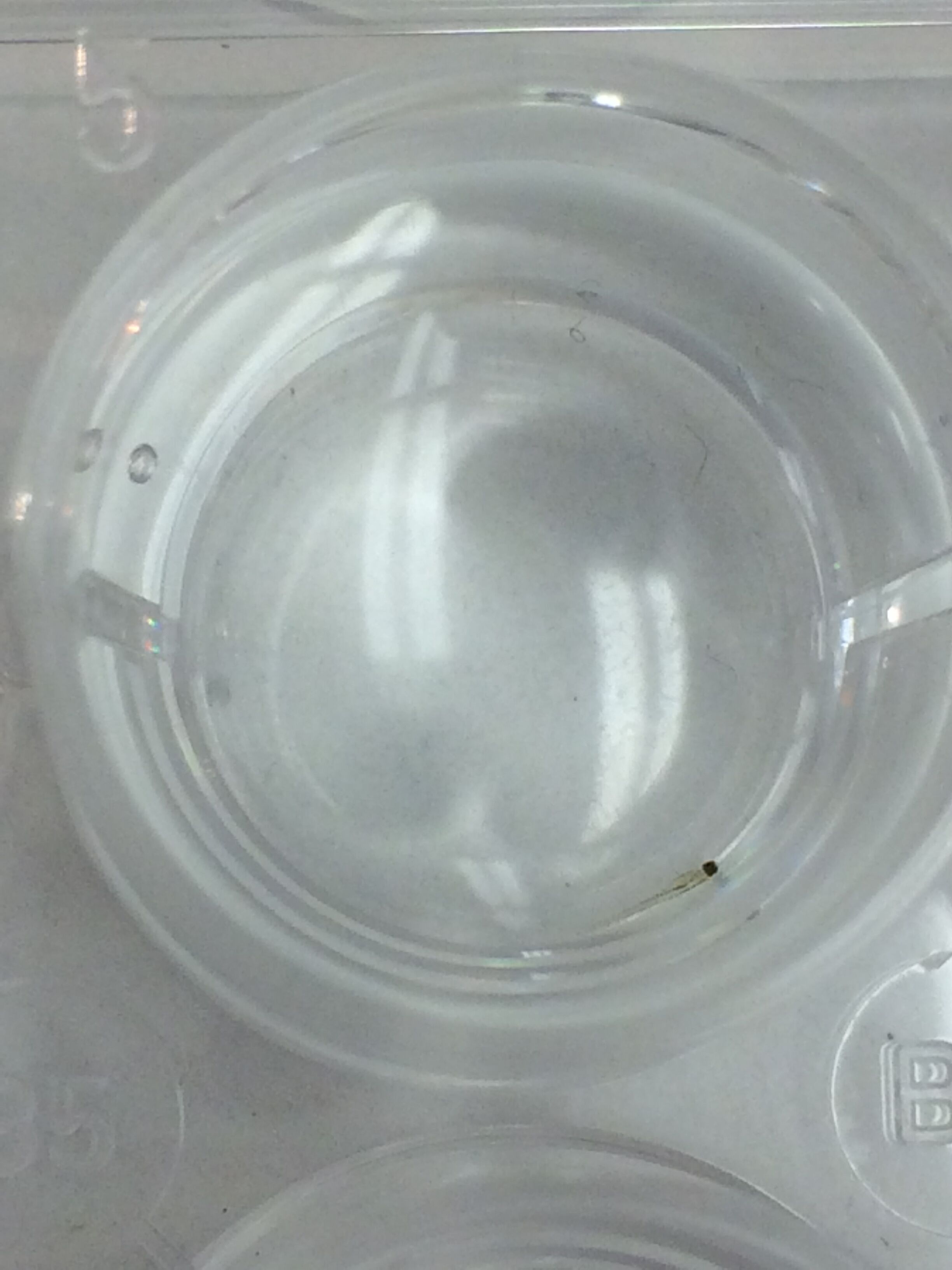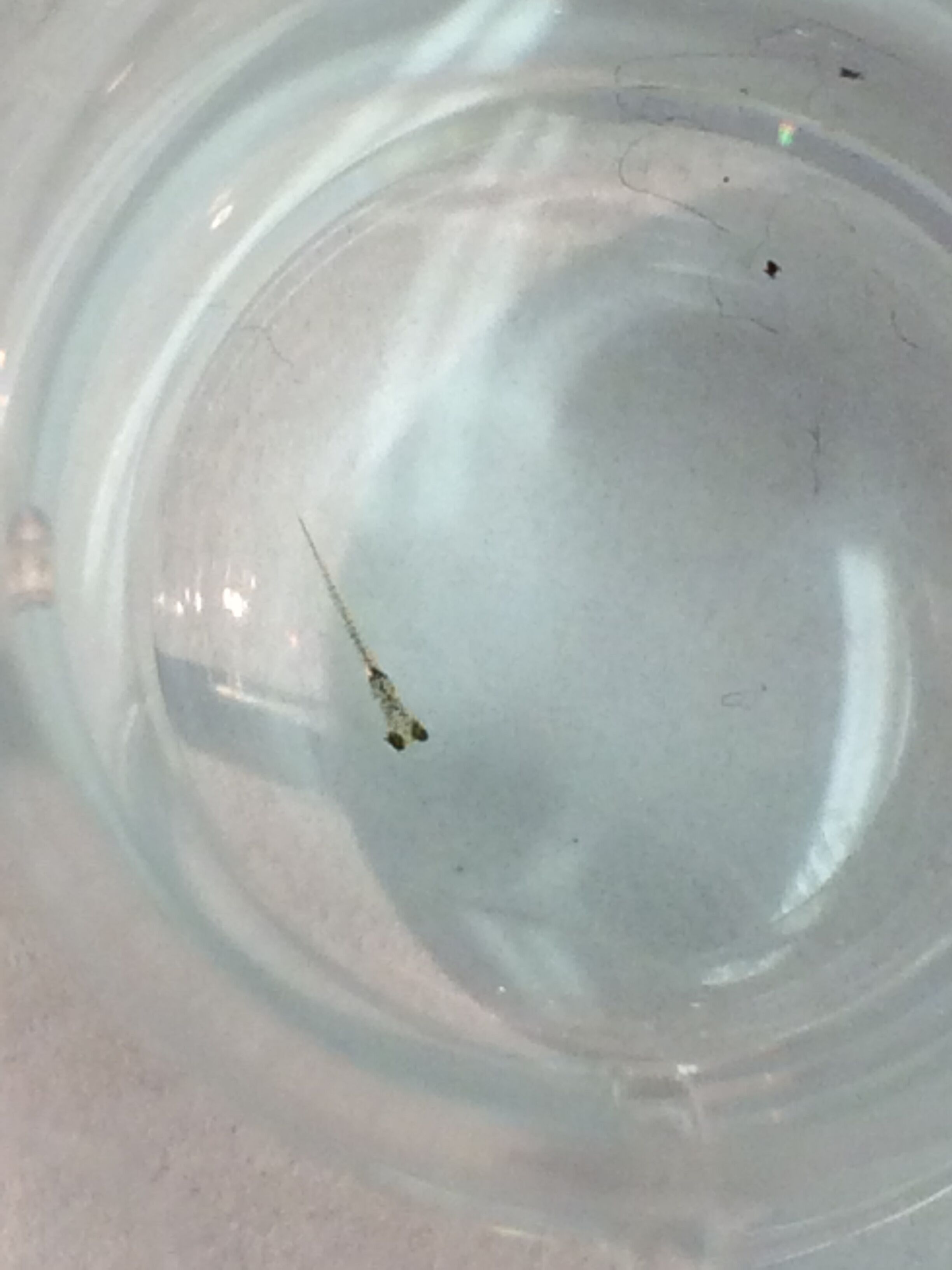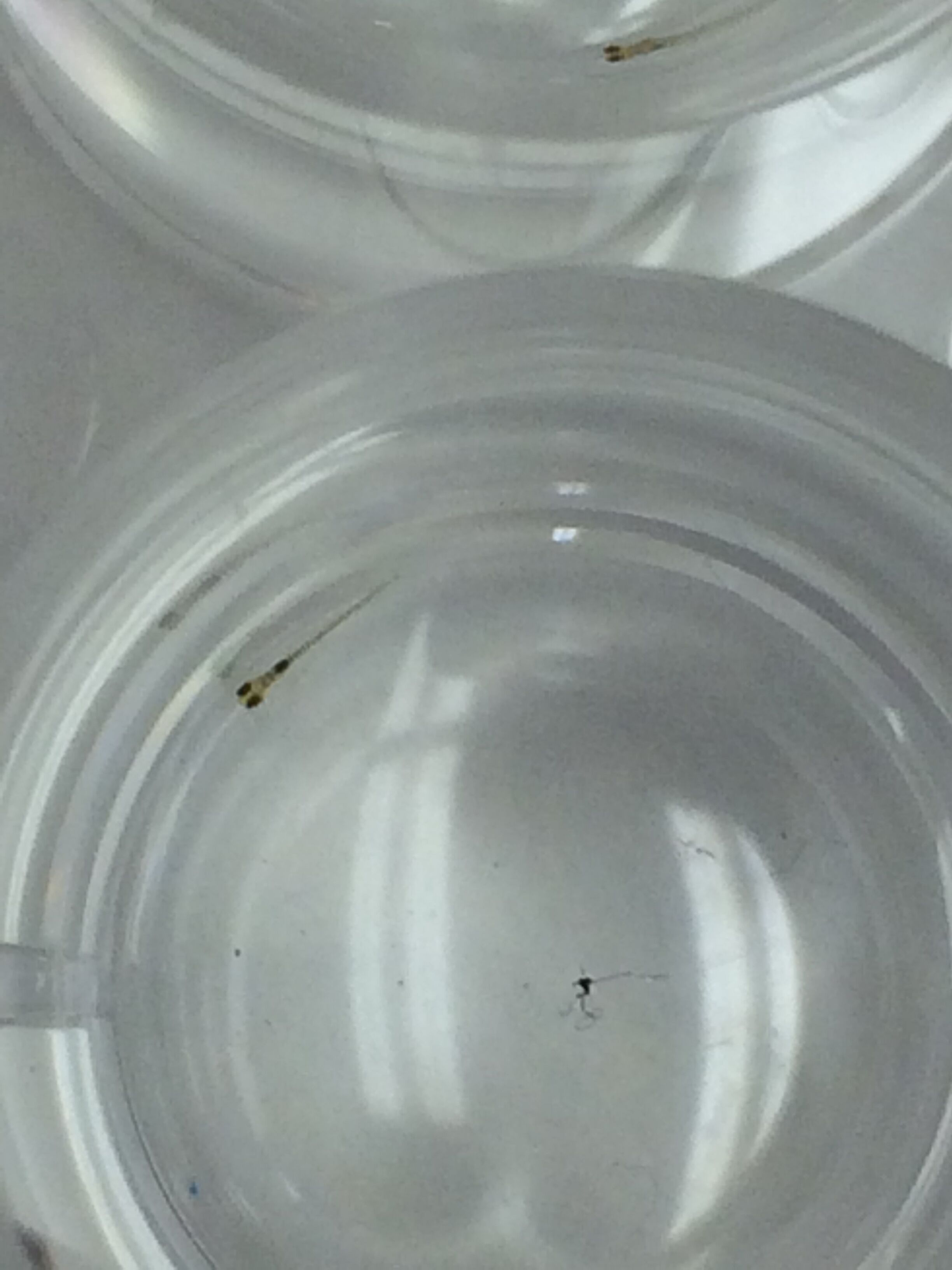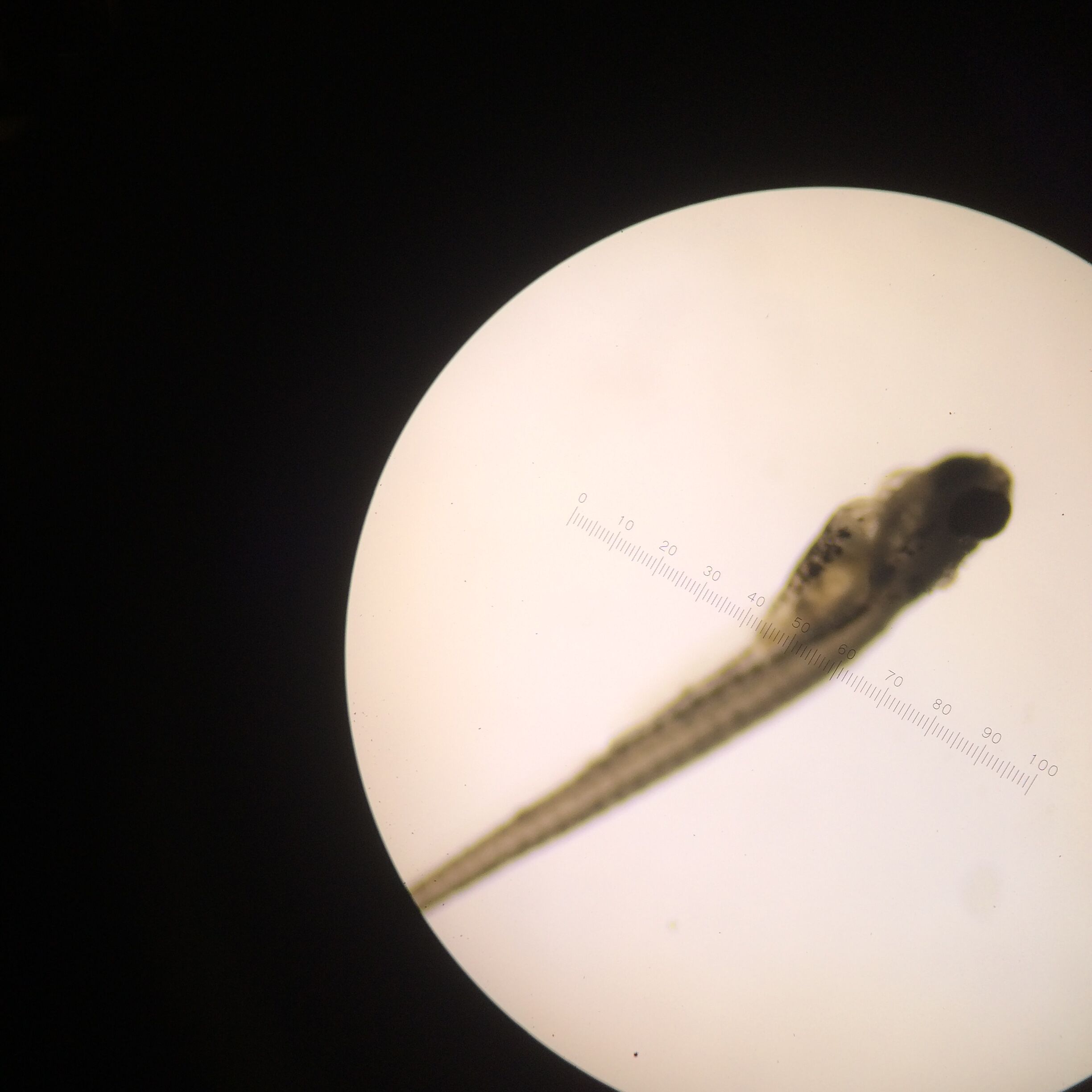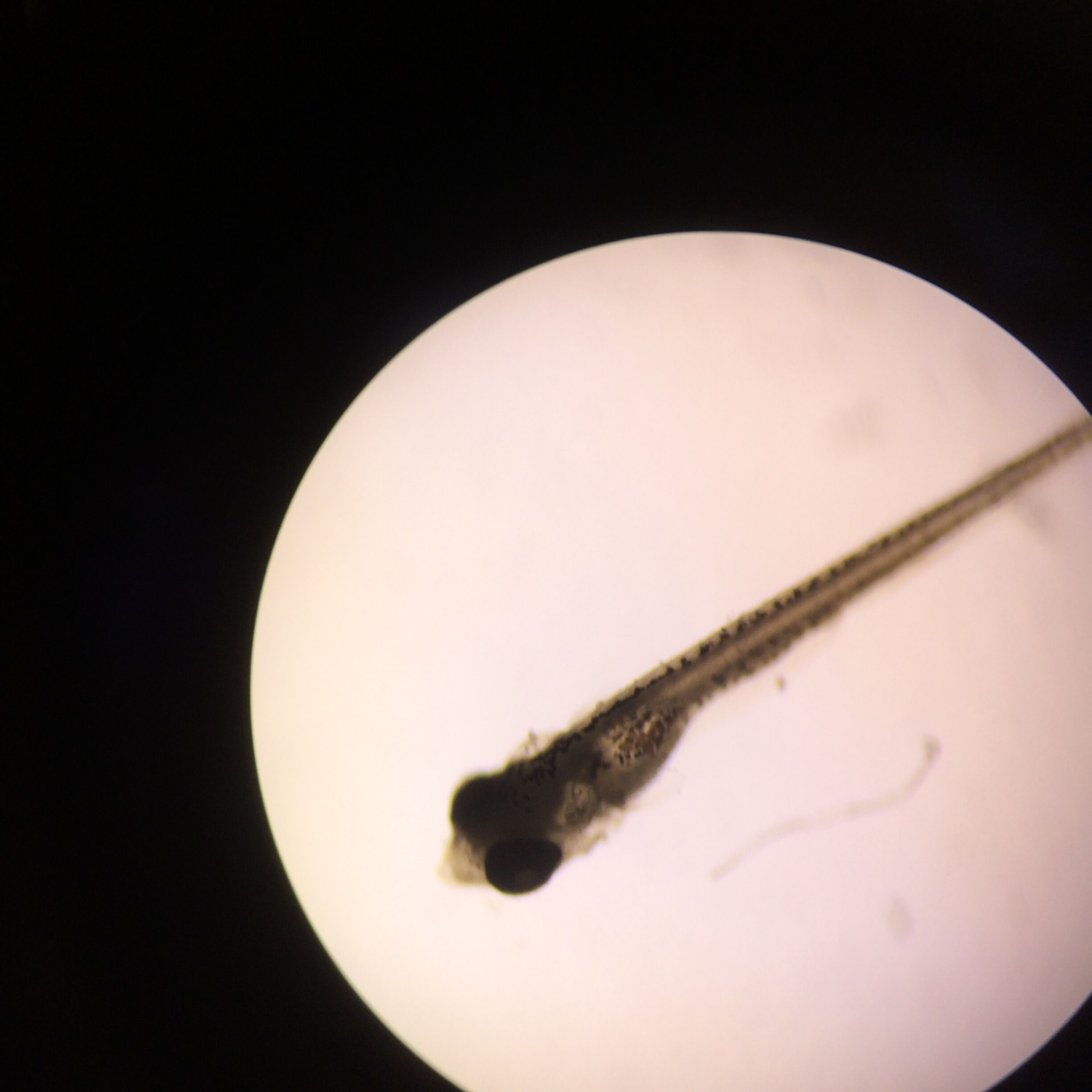 Day 6: Observations of fish were taken. The age was approximated, and since the fish had started to hatch, stimuli response, body length and shape, eye size, motility, and mortality were all recorded. When recording they body and eye size, one fish was chosen from the control and one from the treatment group to represent the rest of the fish. Along with these measurements, the lingering egg casings were pipetted out of the well and each fish was fed 15 microliters of shrimp brine.