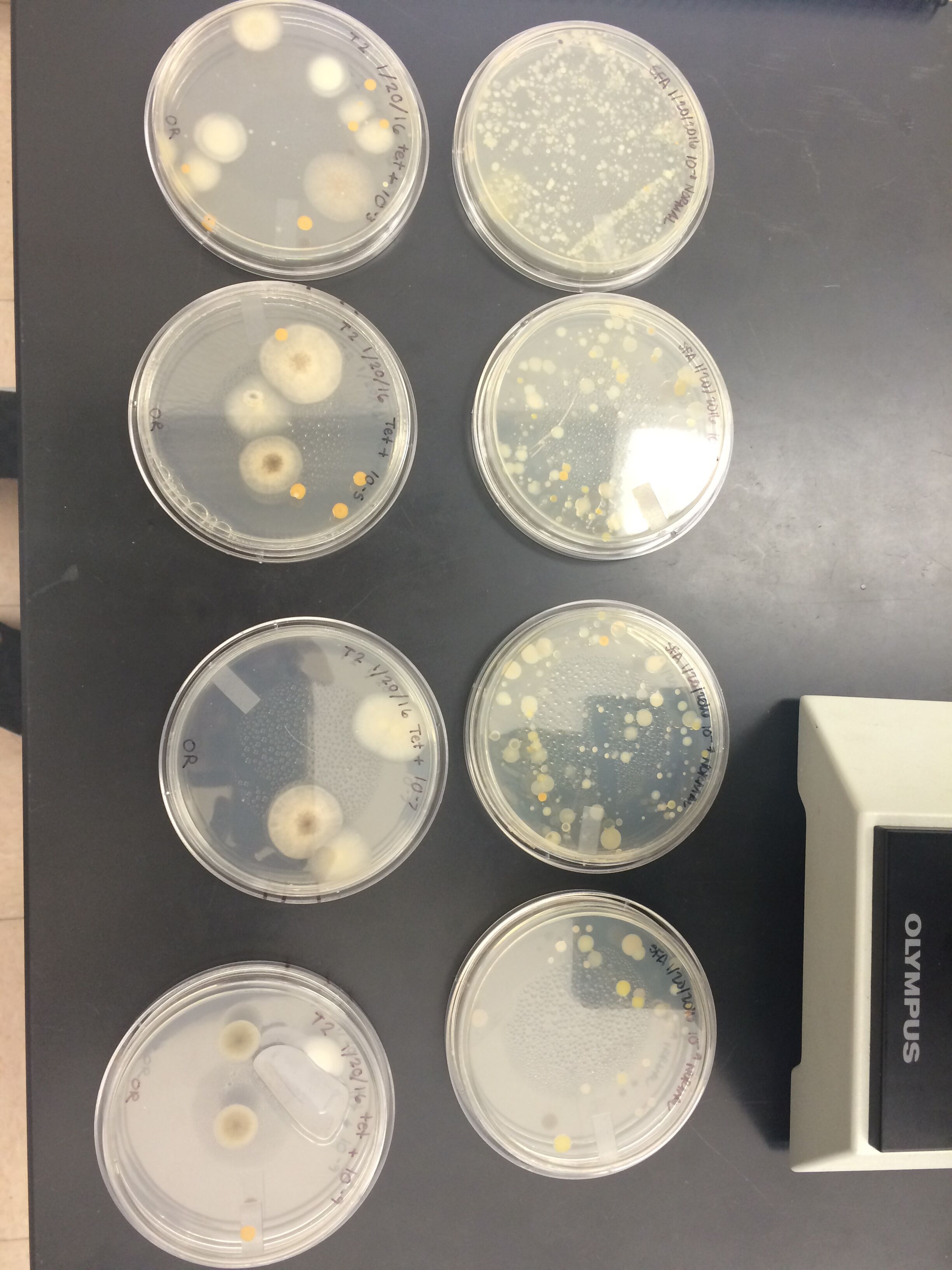 Table 1: Serial Dilutions Results Dilution Agar Type # Colonies on Plate Conversion Factor Colonies/mL 10-3 Nutrient Lawn X103 10-5 Nutrient ~100 X105 10,000,000 10-7 Nutrient ~90 X107 900,000,000 10-9 Nutrient ~27 X109 27,000,000,000 10-3 Nutrient + tet 16 X103 16,000 10-5 Nutrient + tet 7 X105 700,000 10-7 Nutrient + tet 3 X107 30,000,000 10-9 Nutrient + tet 4 X109 4,000,000,000